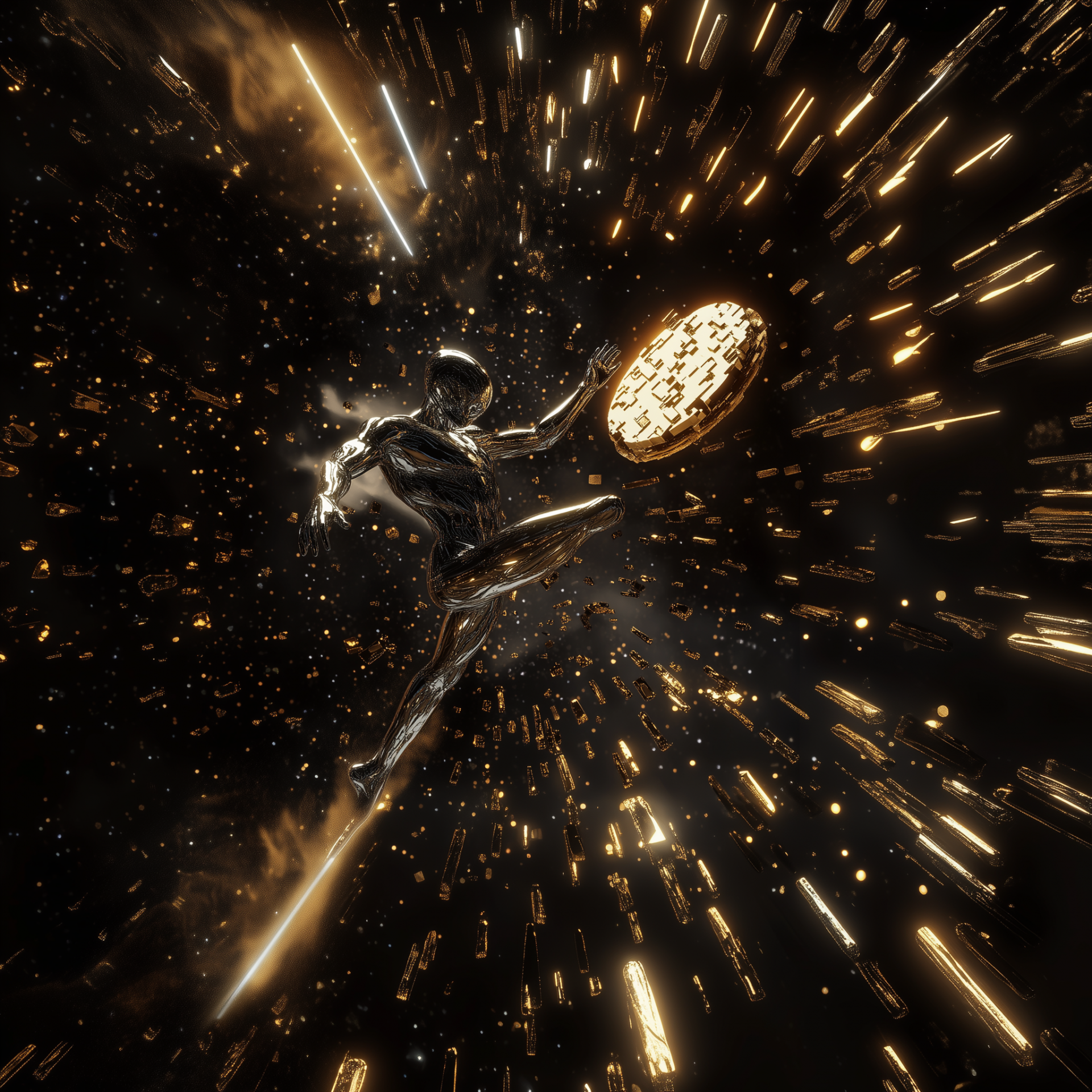 A chrome humanoid with shimmering golden accents floats in a conceptual space filled with dramatic lighting. The cinematic style creates an atmosphere of mystery and progress, as the figure reaches towards a luminous golden orb.
