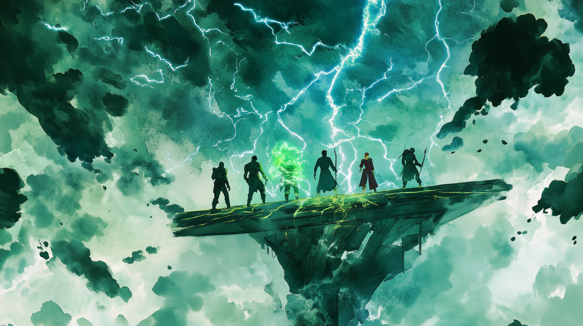 The image features a group of adventurers boldly venturing into a chaotic storm filled with vibrant green and blue lightning. The artwork is done in exquisite detail, showcasing the heroes on a floating platform amidst the swirling tempest.