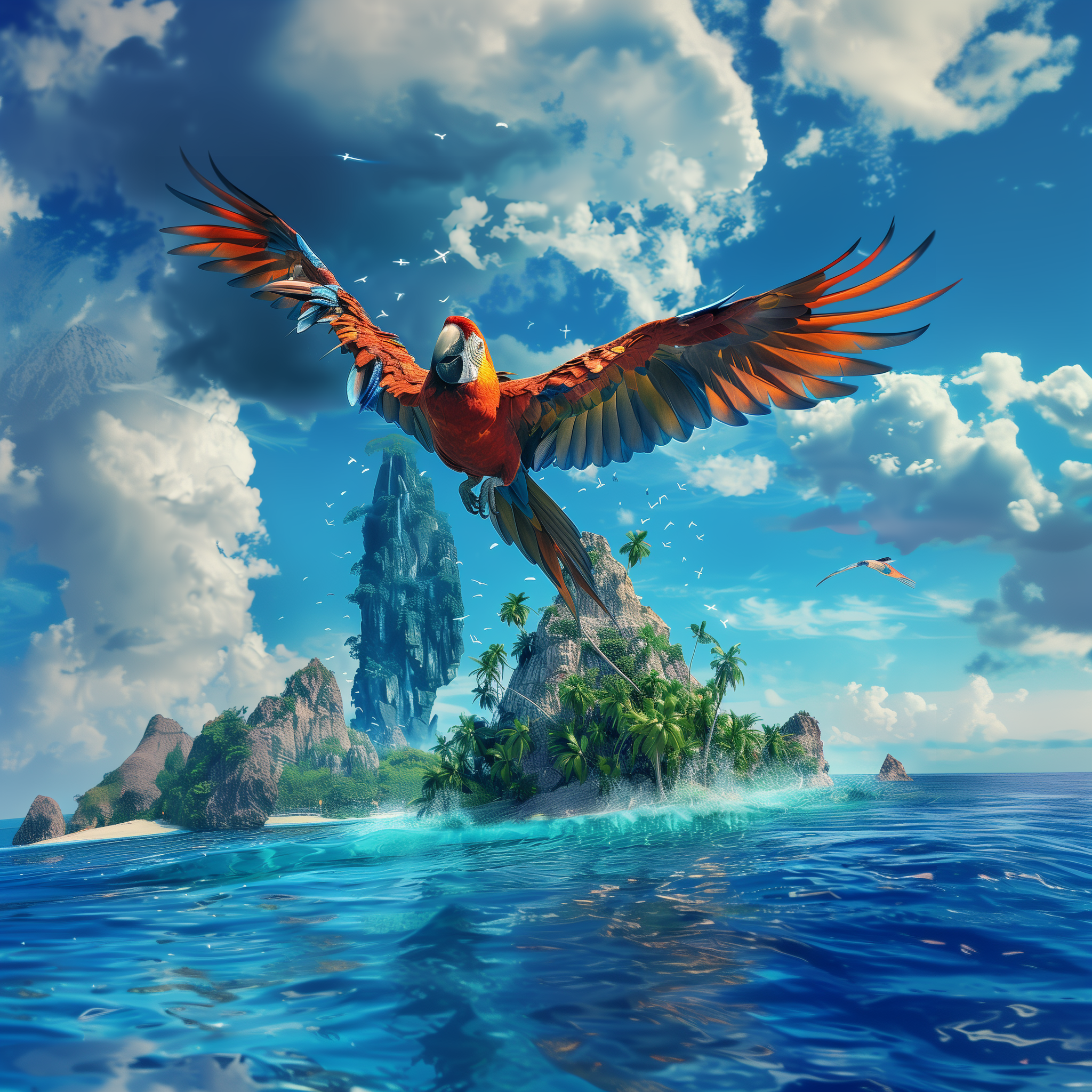 A colorful parrot joyfully flying in the foreground, while a majestic kraken emerges from the deep blue waters behind a tropical island. The vibrant blue sky is adorned with beautifully sculpted clouds, creating an atmosphere of excitement and adventure.