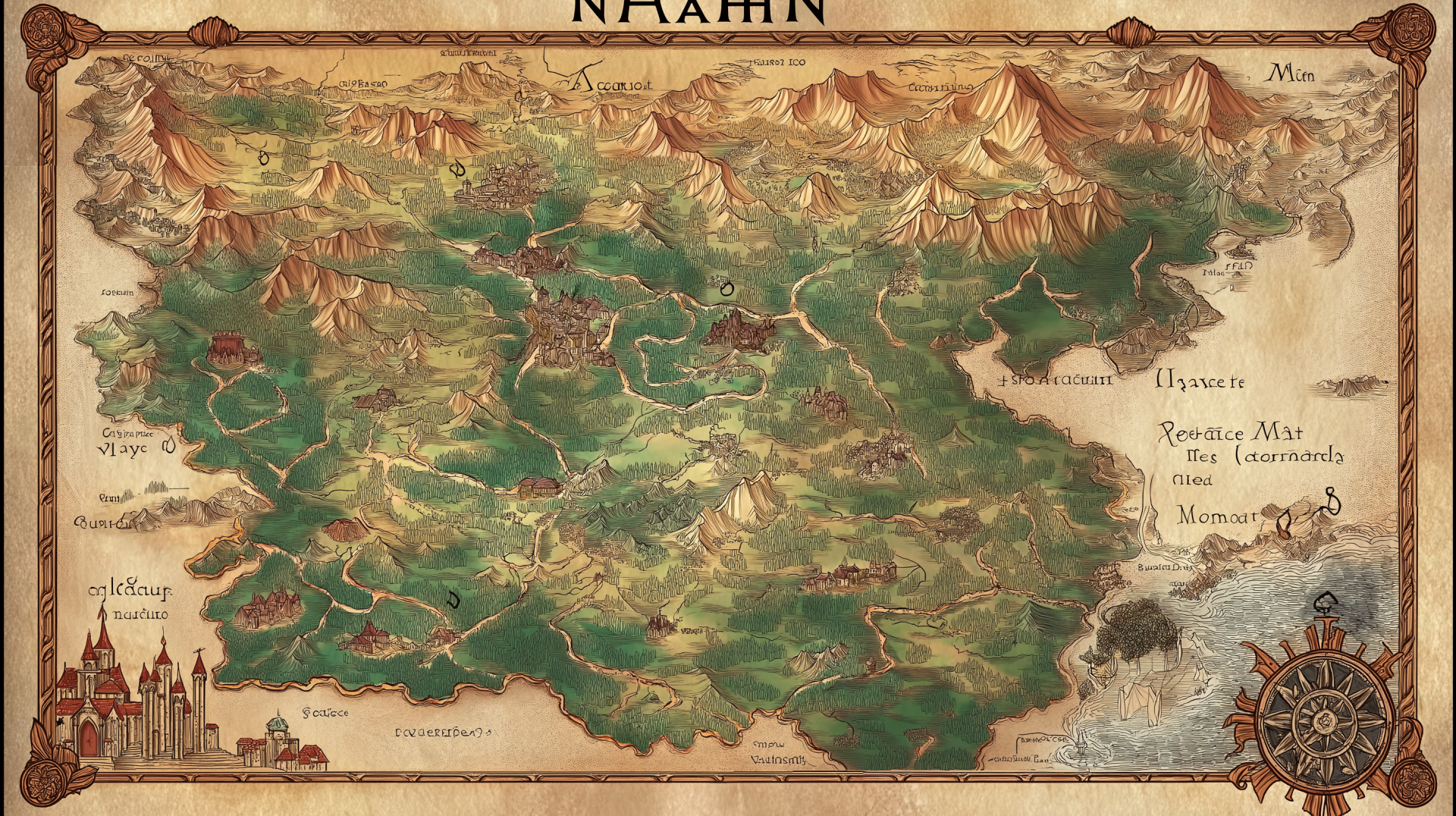 This hand drawn map showcases the unique landscapes and intricate layouts of Narahn, an adventurer's paradise. The style is rich with detail, illustrating the lush forests and coastal villages that define this enchanting microcosm.
