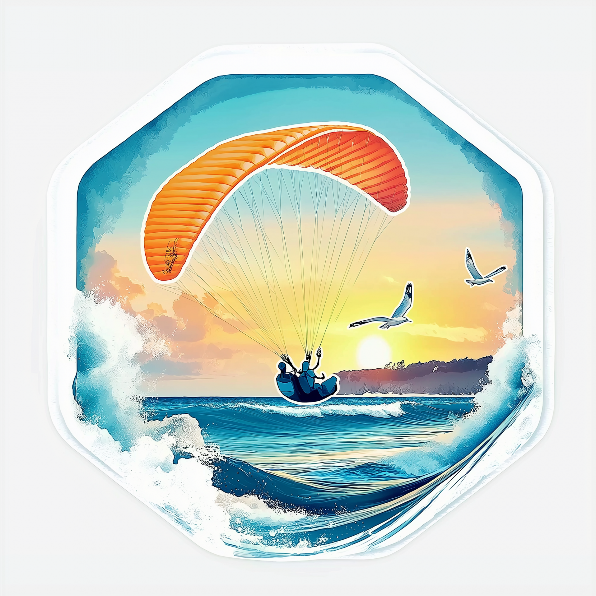 This illustration captures the thrill of paragliding over a serene ocean with a distant island. Seagulls glide alongside the paraglider, all framed within a striking hexagonal design against a clean white background.