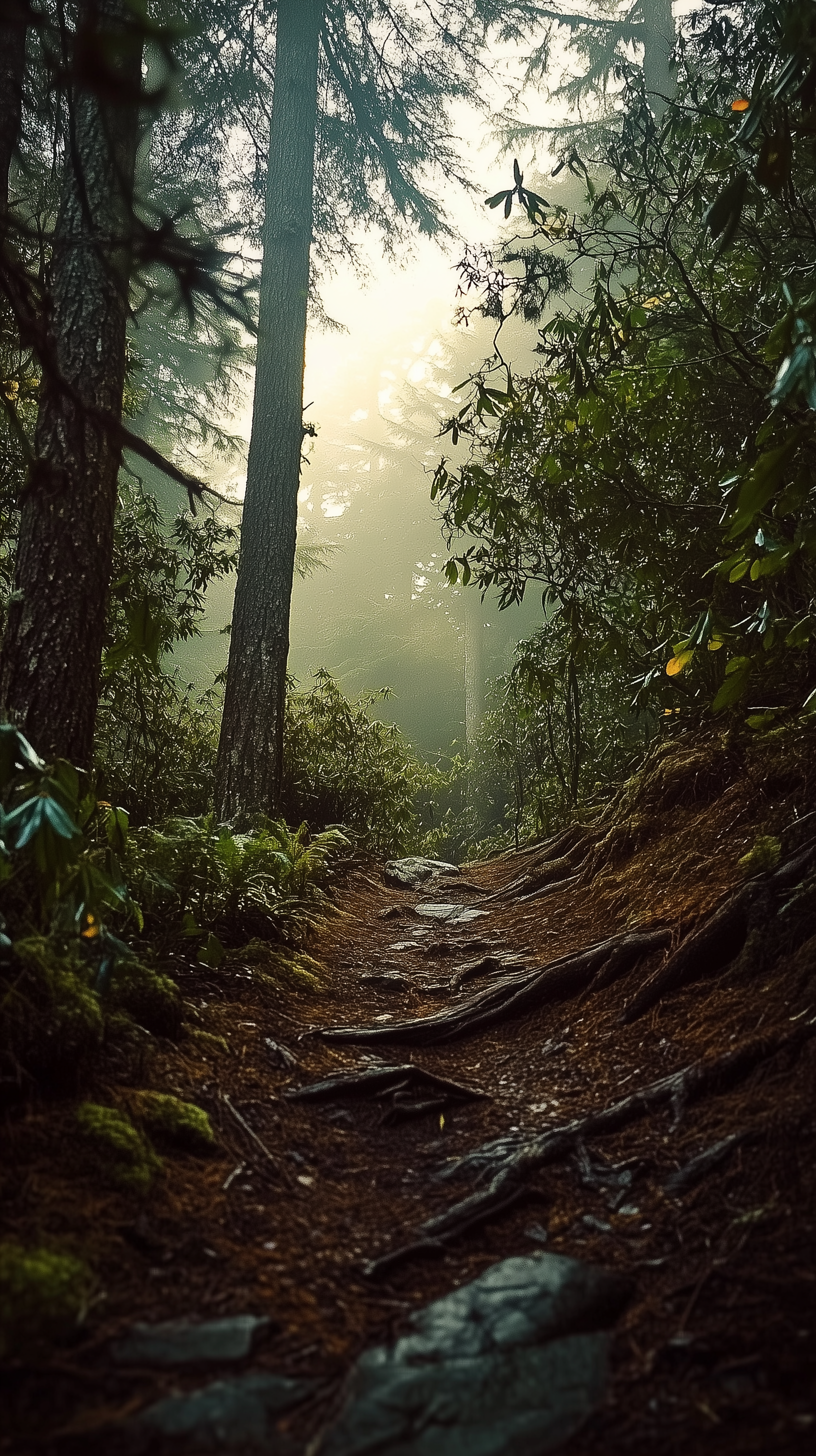 A dramatic and cinematic photograph capturing a first person view of a narrow, rugged hiking trail in a thick pine tree forest. The scene is enveloped in mist, creating a hazy and mysterious atmosphere.