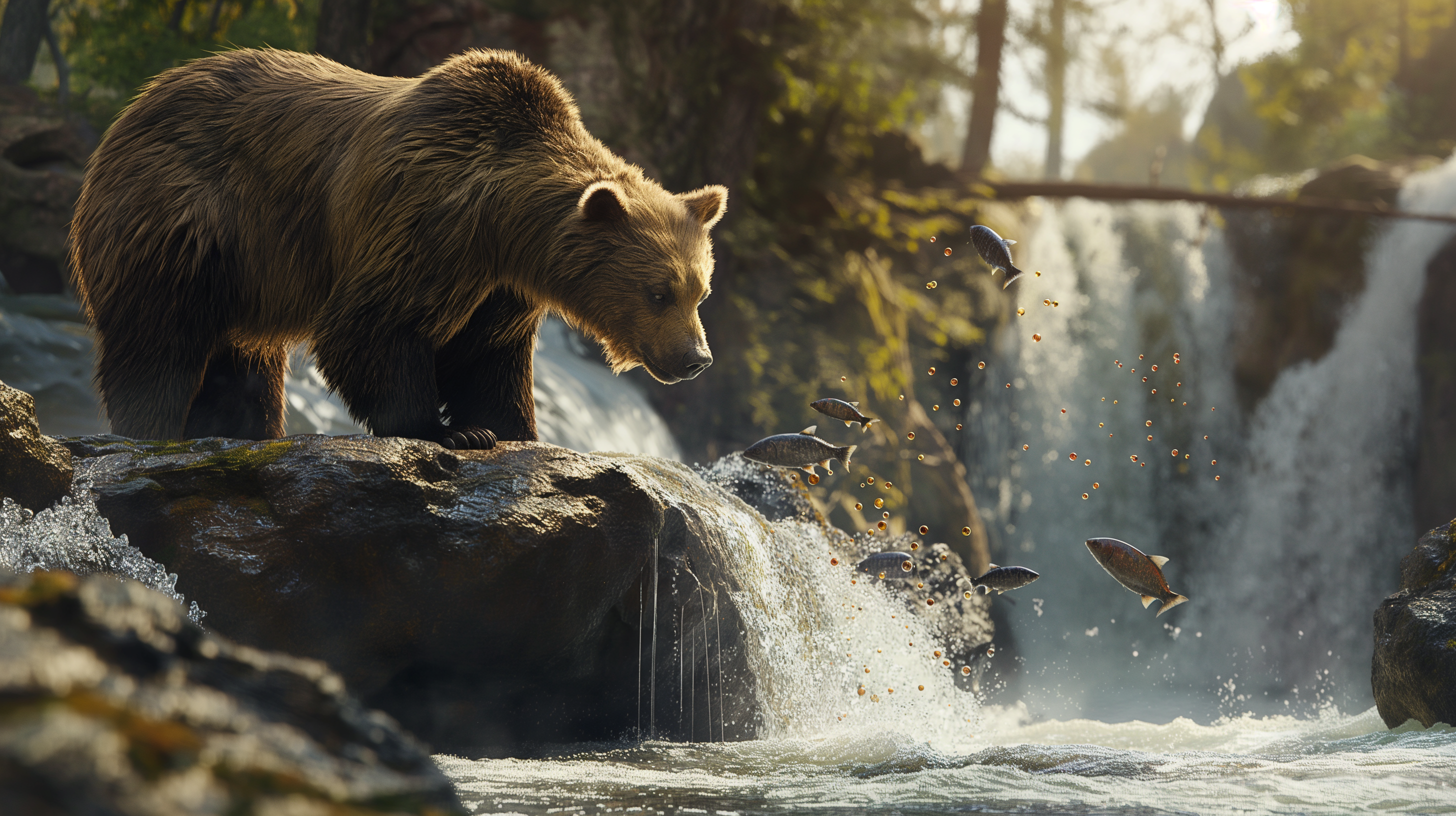 A bear standing on a rock by a river, focused on catching fish that leap out of the water, with splashes around.