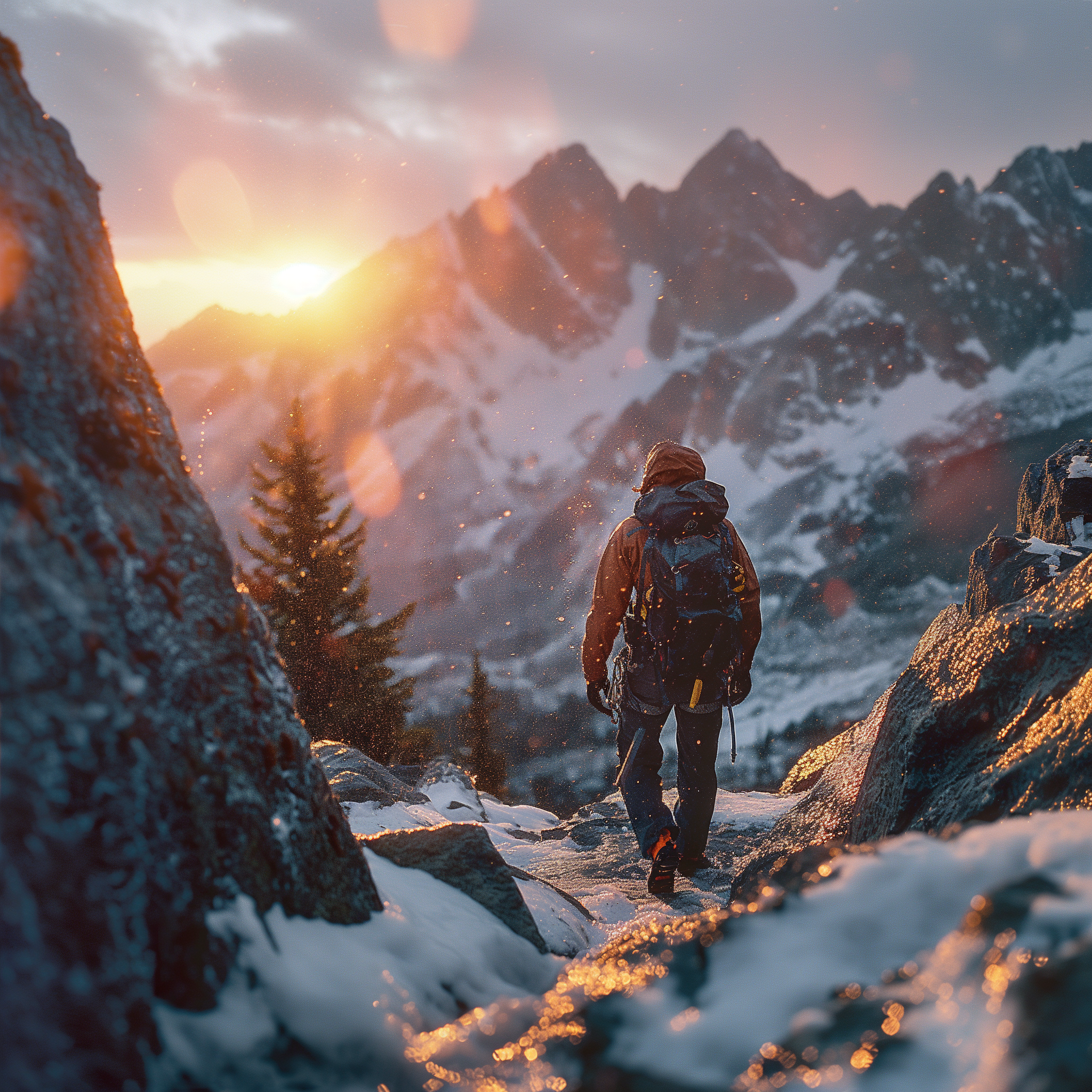 A dramatic photo capturing the harsh conditions at sunset in the Rocky Mountains. The sun backlighting the rain creates a captivating atmosphere, with warm sunlight touching the snowy mountain peaks. A climber equipped with gear stands in front of a large rock, ready to conquer the challenge.