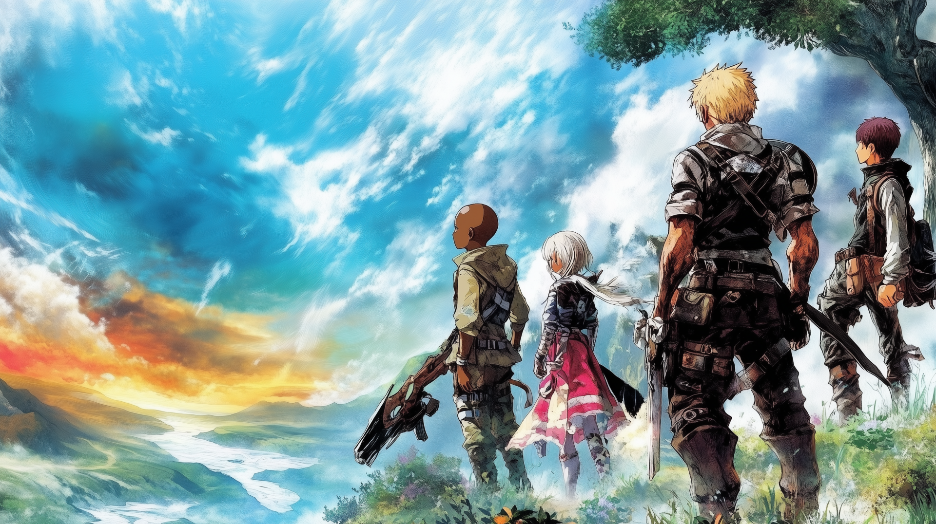 This illustration depicts a group of friends looking out over a breathtaking African landscape at dusk, filled with a striking amber and turquoise sky. Each friend holds a unique weapon, embodying the spirit of adventure and exploration in a vibrant and dynamic setting.