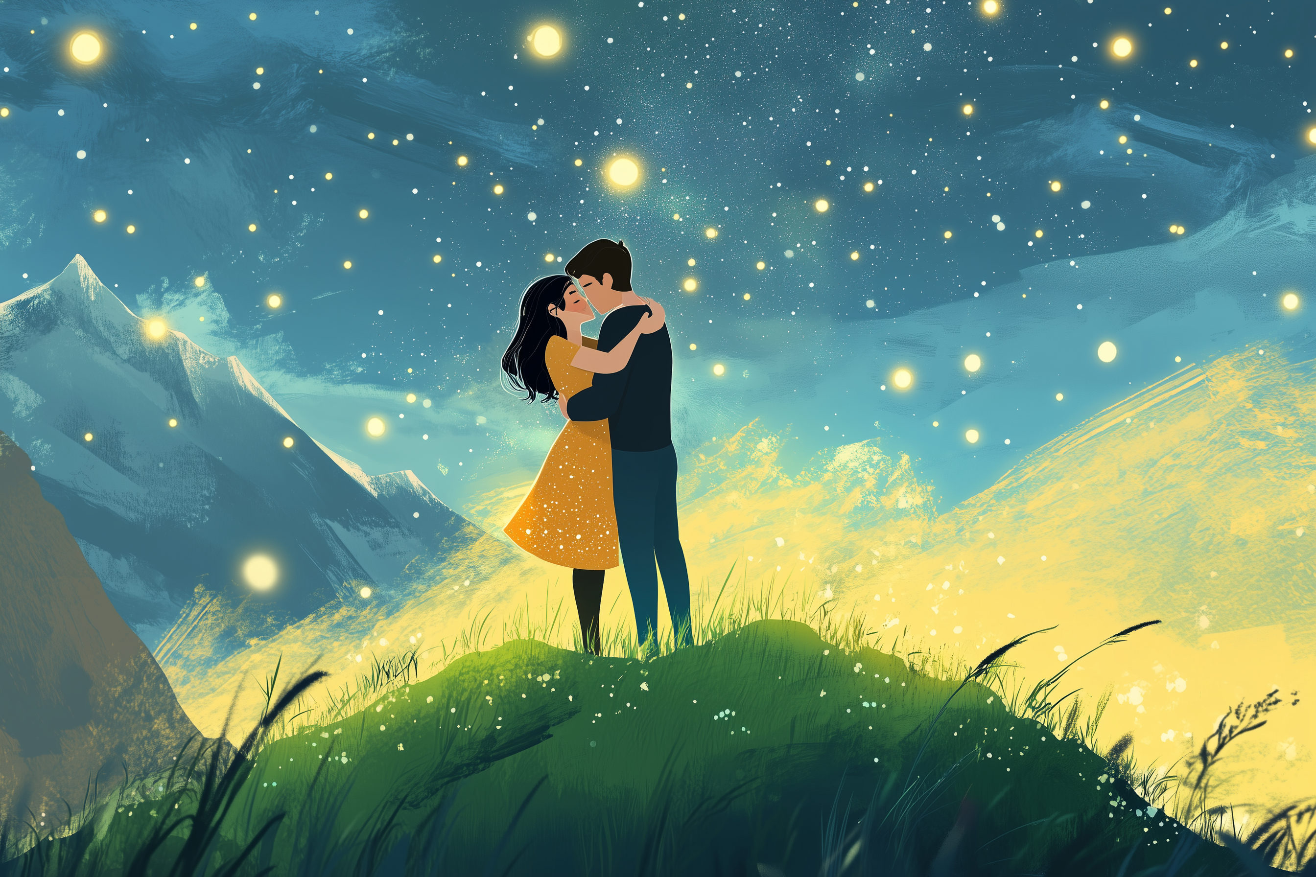 This illustration depicts a couple joyfully embracing each other atop a grassy mountain, surrounded by a breathtaking starry sky. The vibrant green of the grass contrasts beautifully with the deep blues and twinkling lights of the stars, creating a romantic and serene atmosphere.
