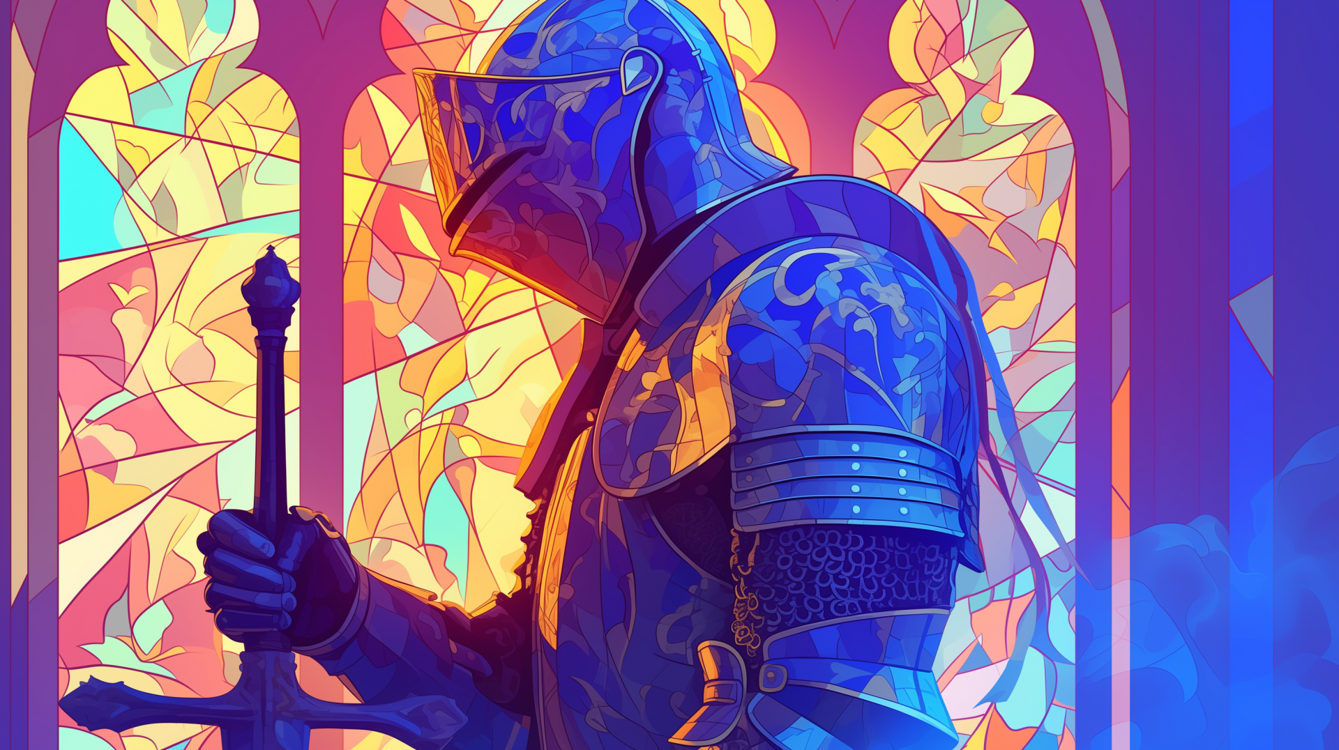 This illustration depicts a knight in broken armor, showcased in a vibrant stained glass style. The cinematic lighting enhances the deep colors, creating a dramatic and captivating atmosphere.