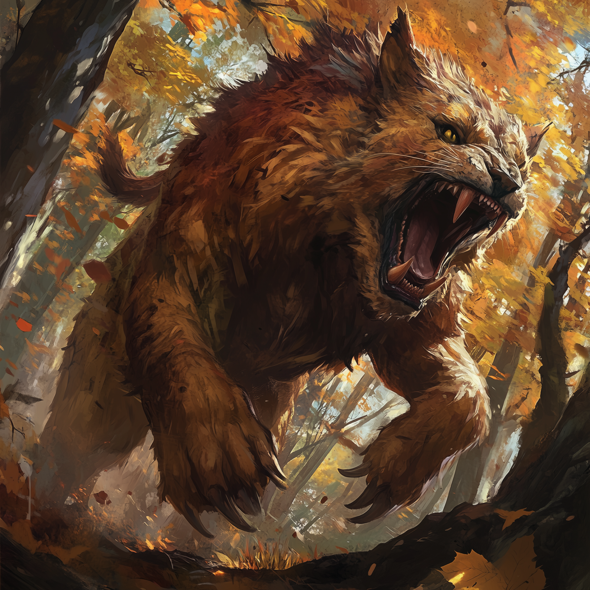 The image features a large, fantastical creature that is a combination of a manticore and a mountain lion, depicted in an attacking pose. Set in a vibrant forest with fall colors and cinematic lighting, the style is slightly cartoonish, enhancing the high fantasy feel.