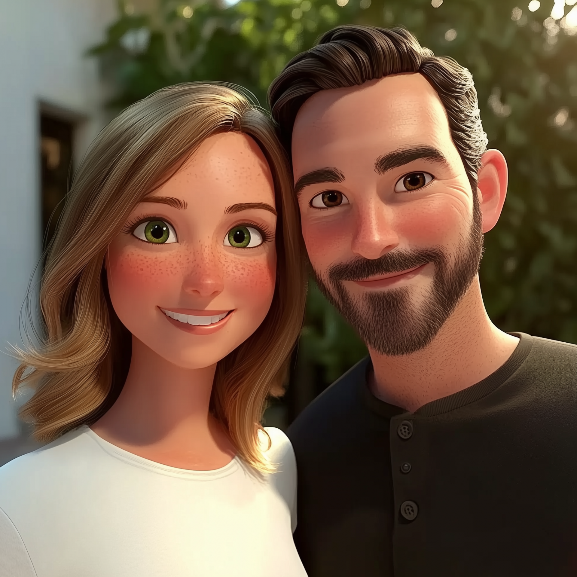 This illustration showcases a whimsical transformation of a couple set in a beautiful outdoor environment. The soft natural lighting enhances the enchanting features of the characters, giving them a vibrant and lively appearance.