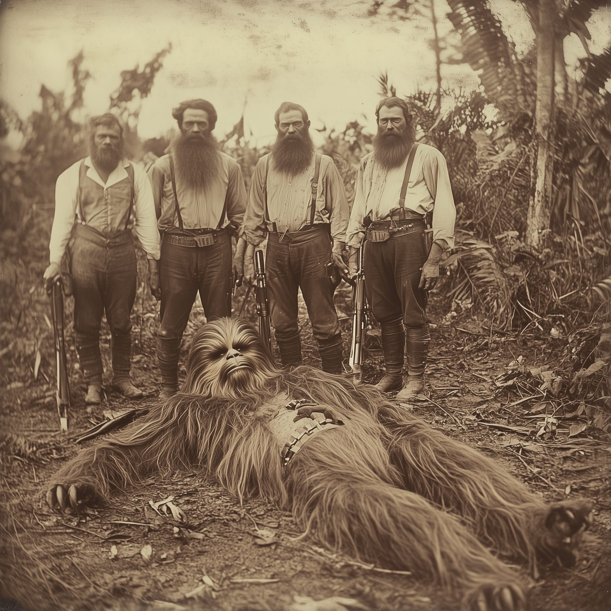 The image captures a group of hunters dressed in 1800s attire, set against the lush backdrop of the Amazon rainforest. The photograph has a grainy feel, enhancing the historical atmosphere and bringing a sense of nostalgia to the scene.