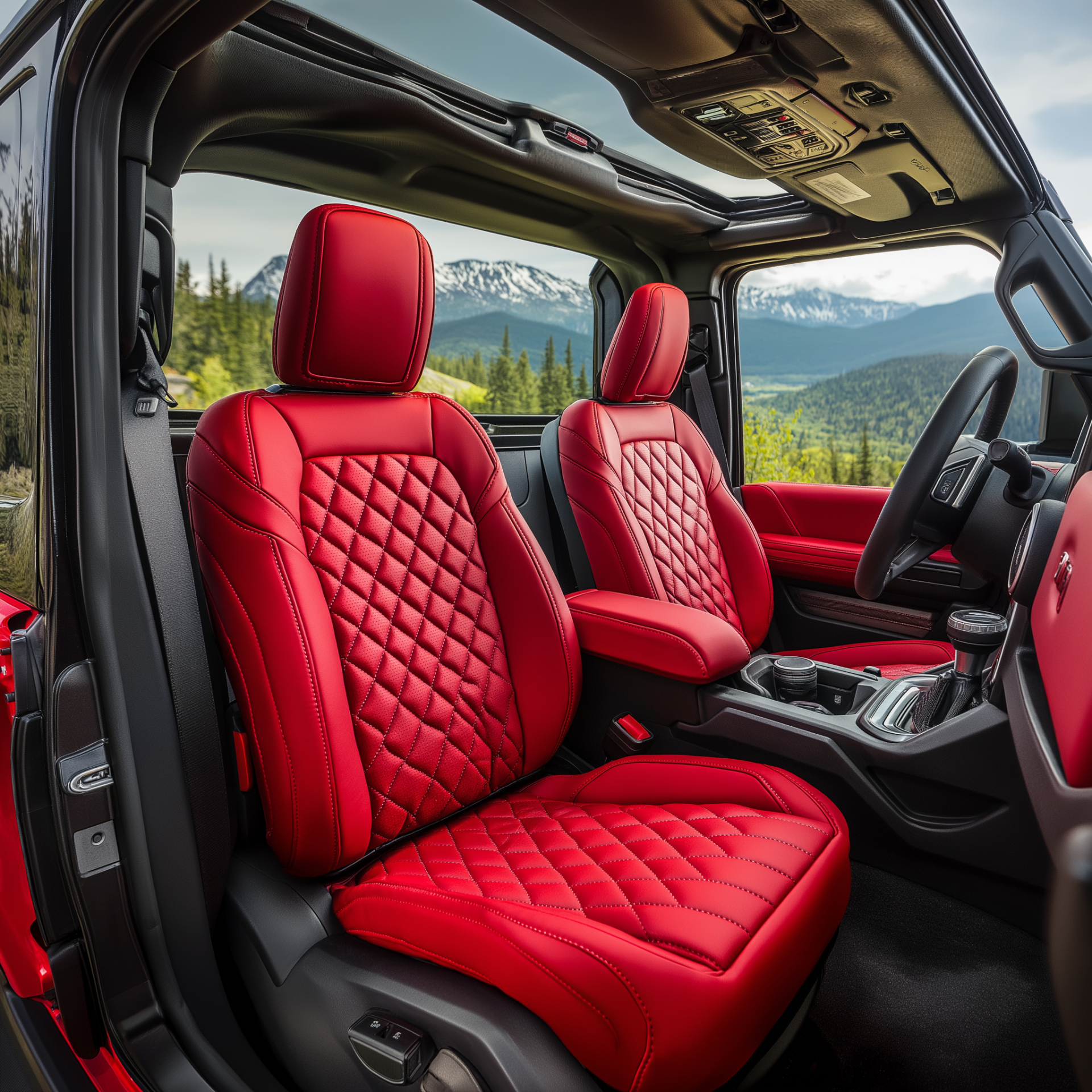 The image showcases the vibrant interior of a Jeep Wrangler with striking red seat covers, creating a bold and adventurous atmosphere. The high-definition quality highlights the modern design elements and rugged appeal of the vehicle's interior.