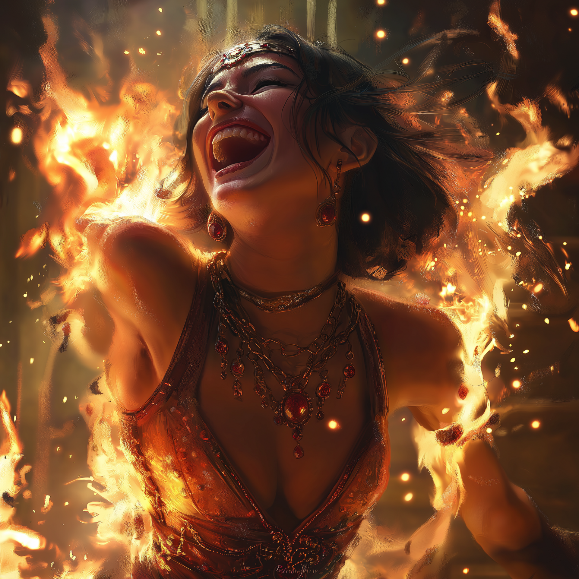 The image showcases a whimsical and daring scene featuring a girl dressed in thief attire, surrounded by vivid flames yet appearing carefree. Her laughter captures a sense of mischief and adventure amidst a chaotic backdrop of fire.