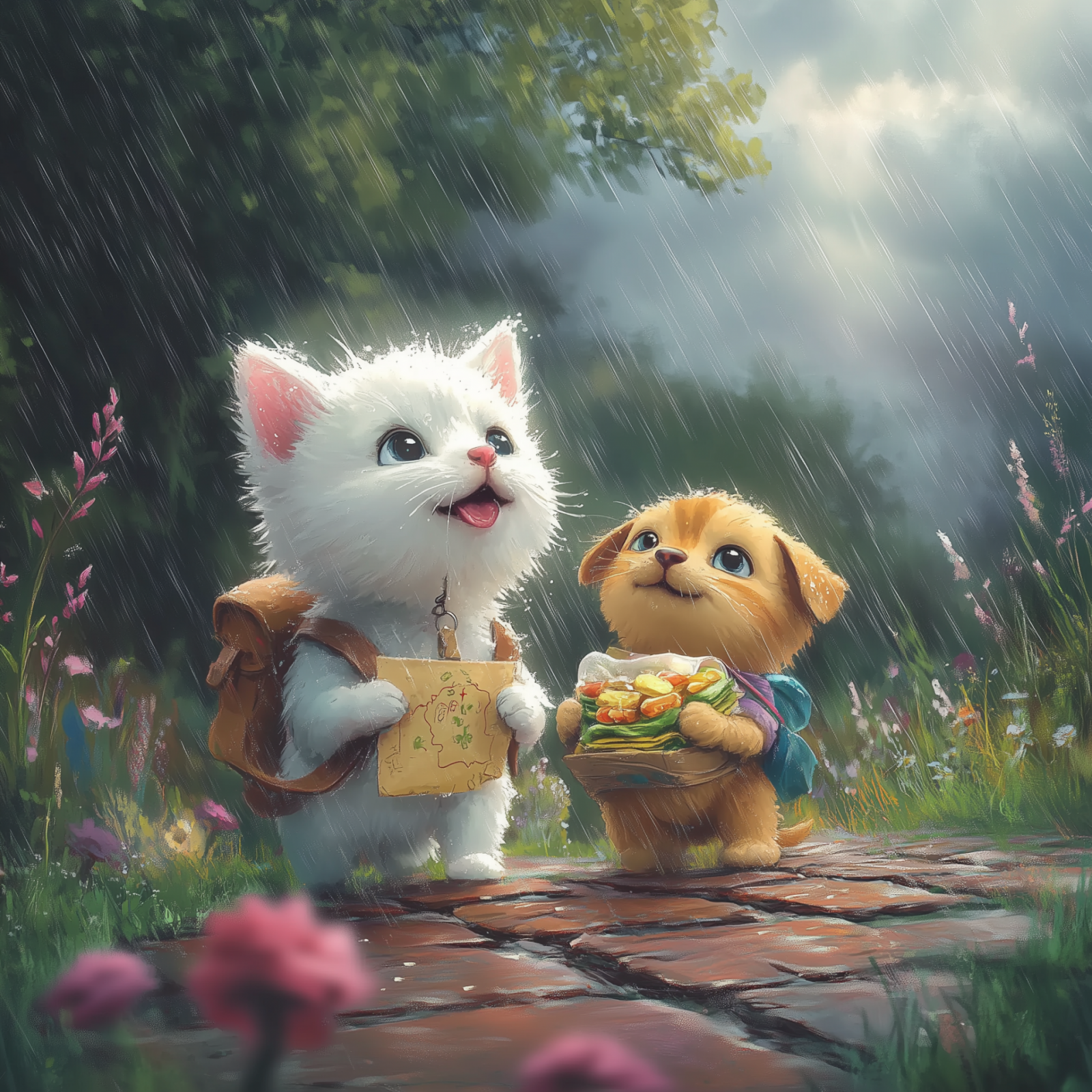 A gray sky looms overhead, creating a moody backdrop for a playful scene. A cute kitten and an enthusiastic puppy are seen dashing into the distance, carrying a map and a backpack filled with sandwiches, exuding a sense of adventure and joy.