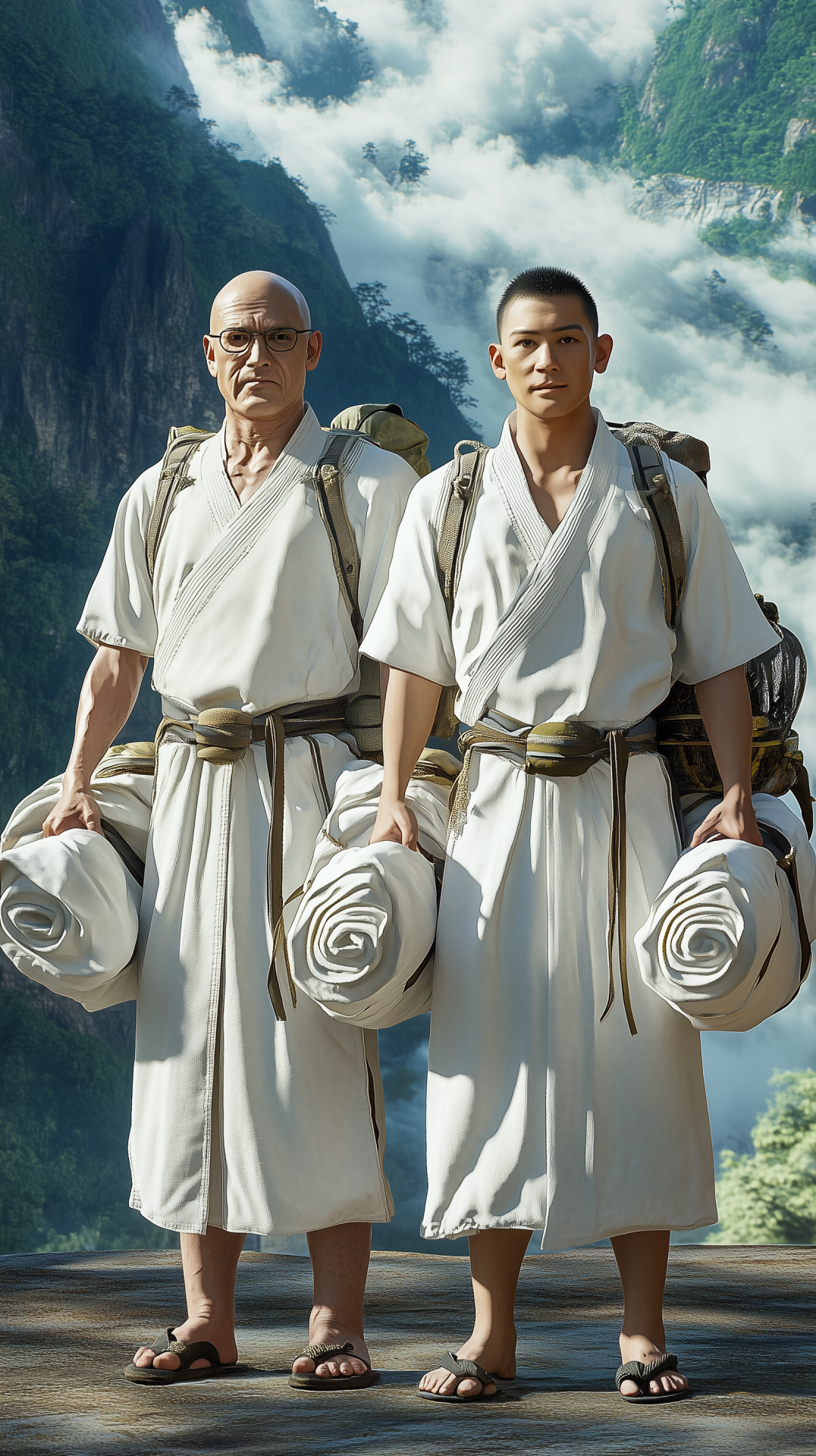 The image captures two travelers standing together in a picturesque outdoor landscape. They are dressed in traditional white martial arts uniforms, creating a serene and adventurous atmosphere.