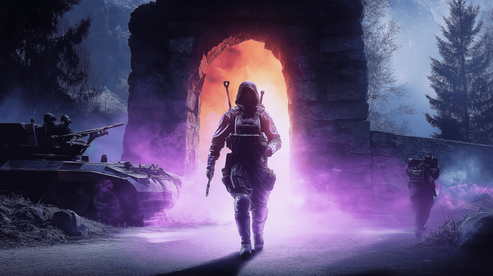The image captures a character walking through a mystical portal surrounded by a swirling purple haze. It showcases a vibrant, fantasy-like atmosphere that evokes a sense of adventure and intrigue.