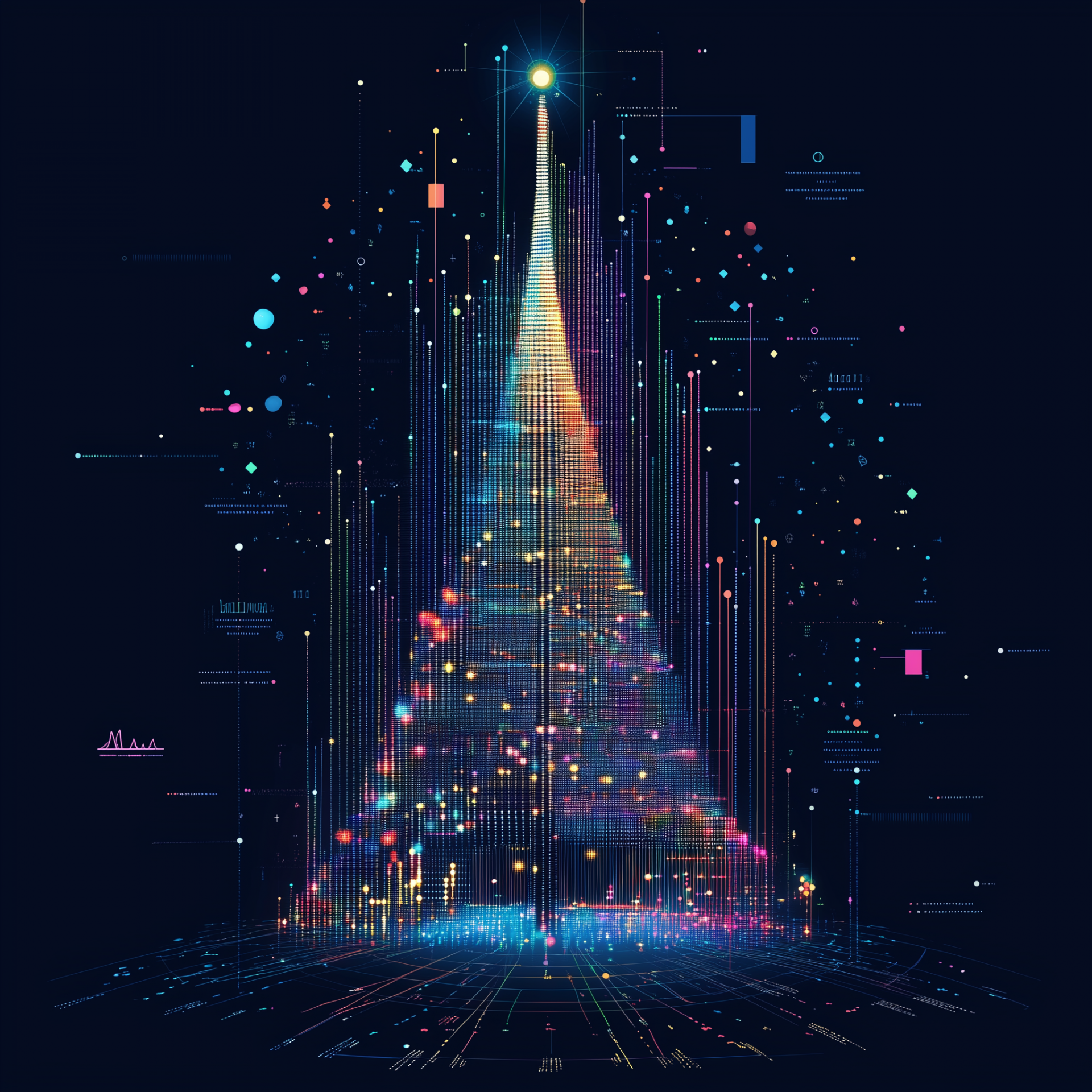 This image features an abstract Christmas tree crafted from pixels and data segments, adorned with decorative charts. The shiny and colorful tree stands out against a dark blue background, creating a modern and festive atmosphere.