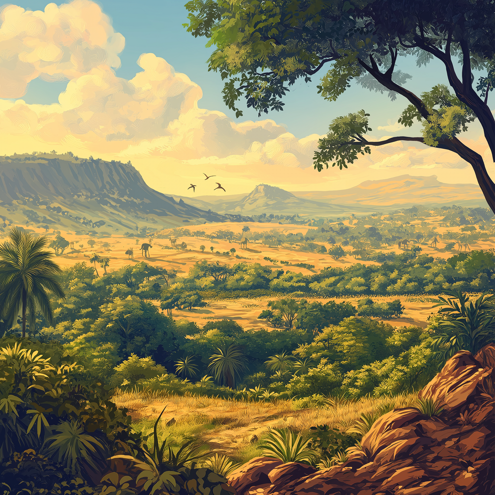 The illustration features a stunning subsaharan landscape showcasing rich colors that reflect the warmth and beauty of Africa. It captures the essence of the region's natural charm, inviting viewers to appreciate its captivating scenery.