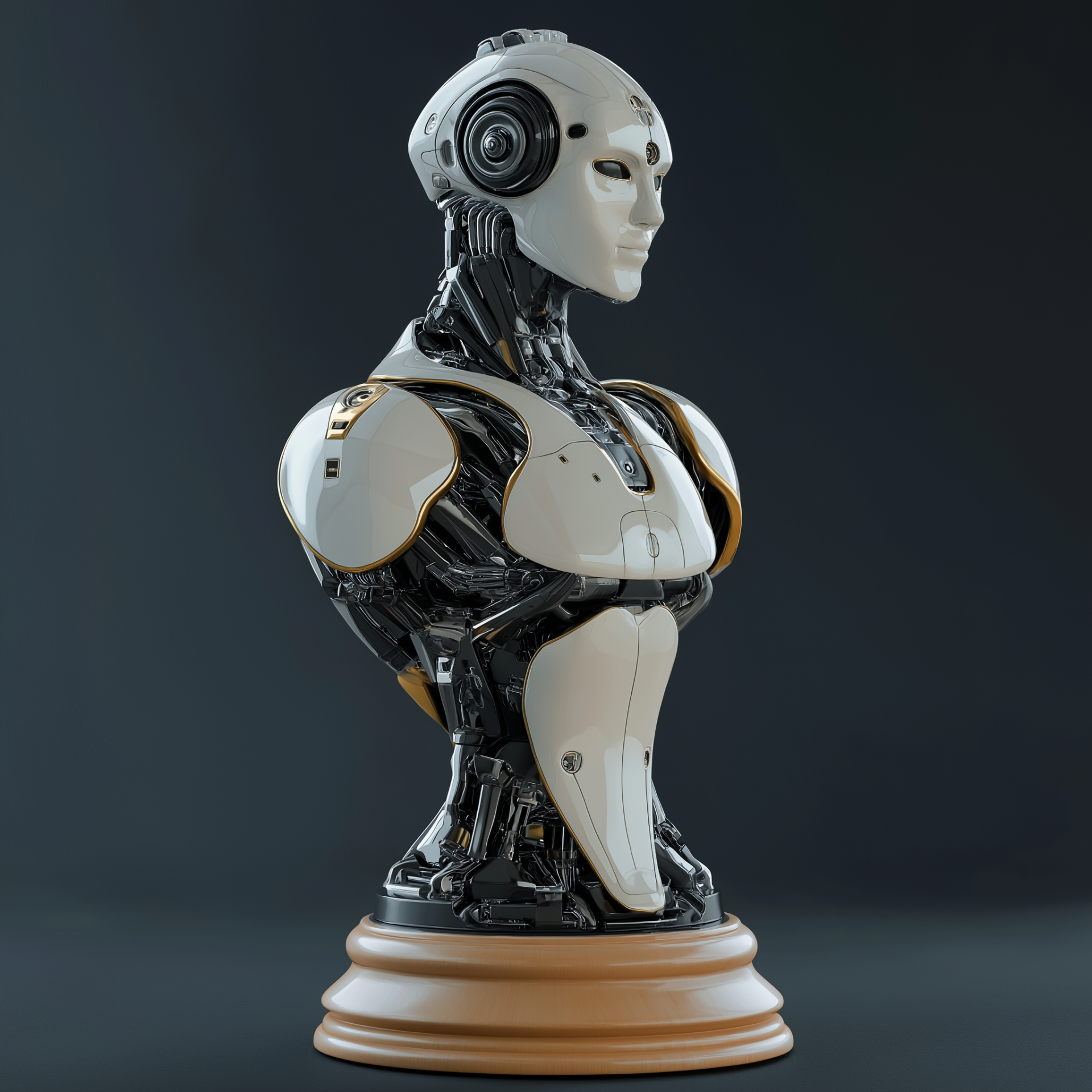 This illustration features a futuristic AI robot designed as a king chess piece, standing elegantly on a chess base. The design showcases sleek lines and advanced technology, embodying a blend of tradition and innovation.