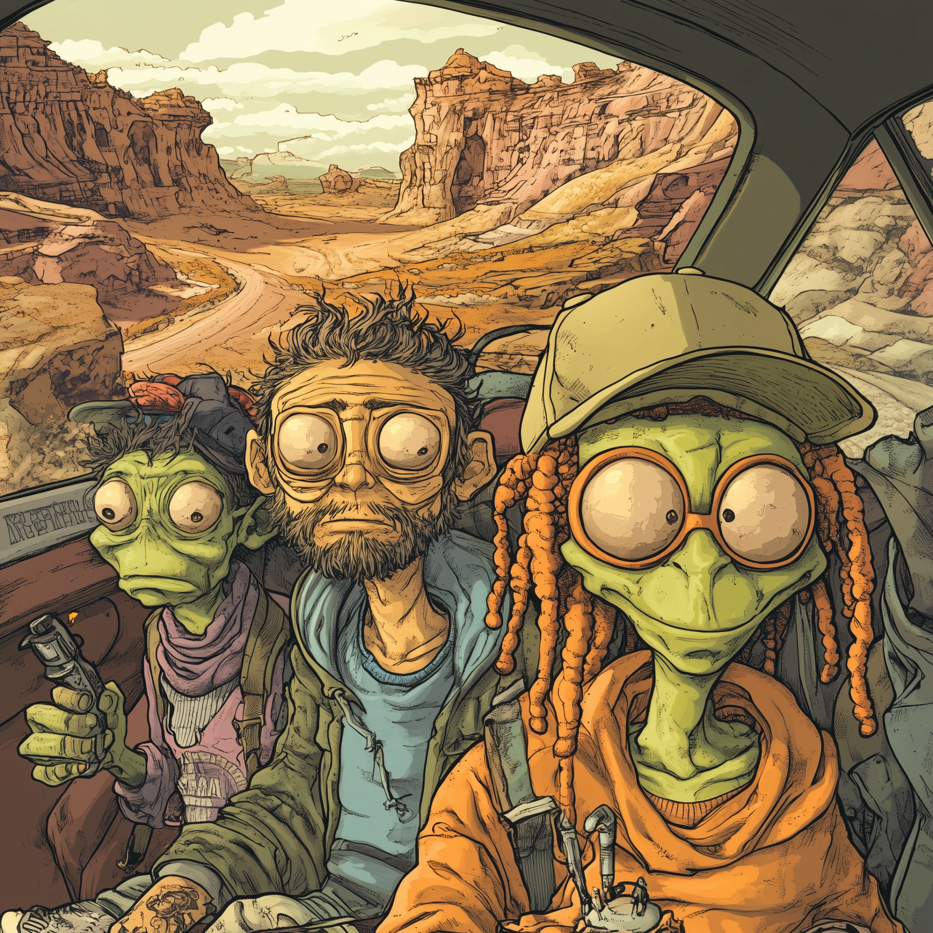 This whimsical image features four tiny aliens squeezed together on a small vacuum cleaner. The colorful and playful design evokes a sense of fun and curiosity.