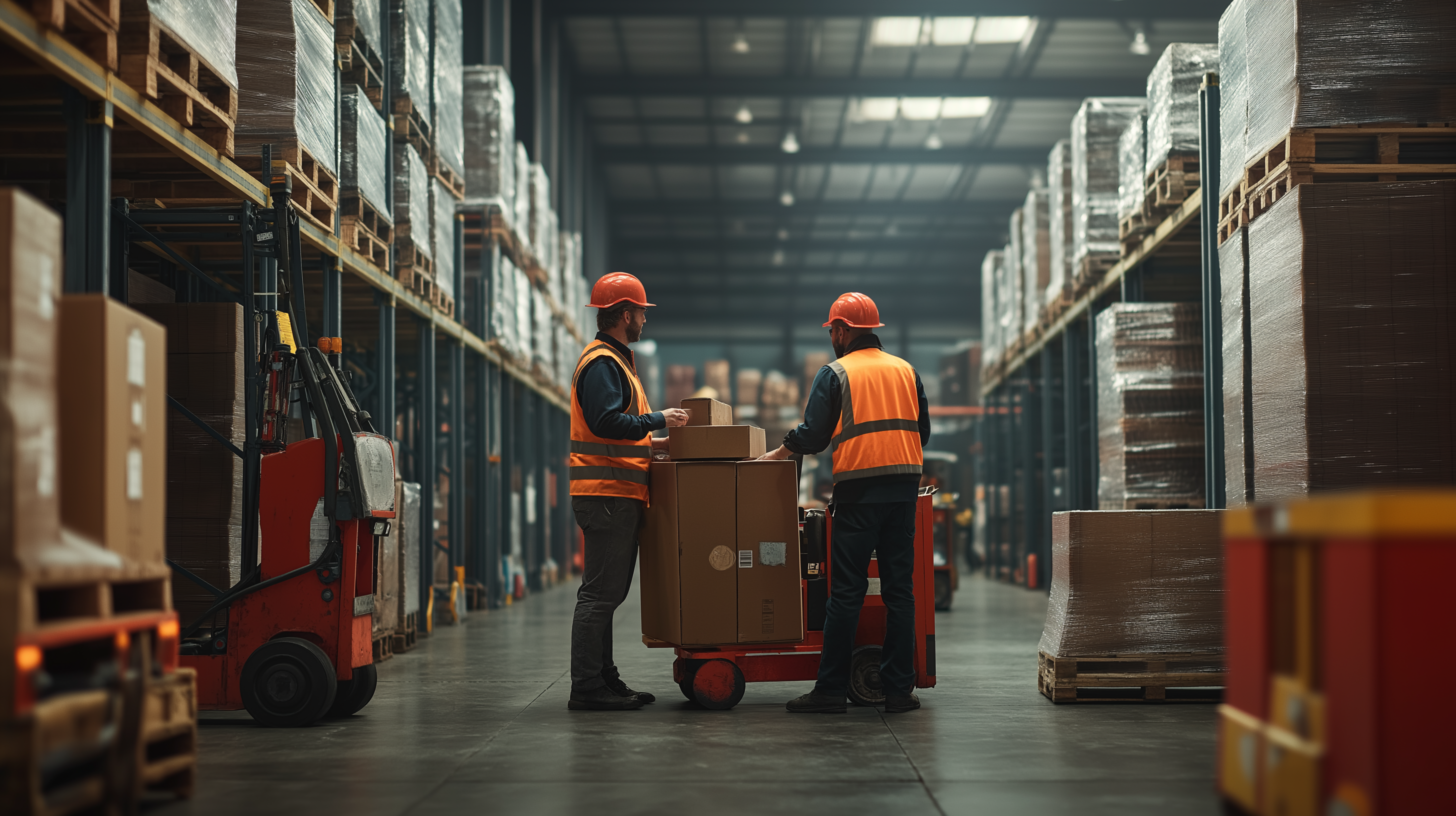 An ultra-high resolution photo capturing warehouse workers collaborating seamlessly in a bustling industrial setting. The image showcases the dynamic teamwork and coordination amongst the workers.