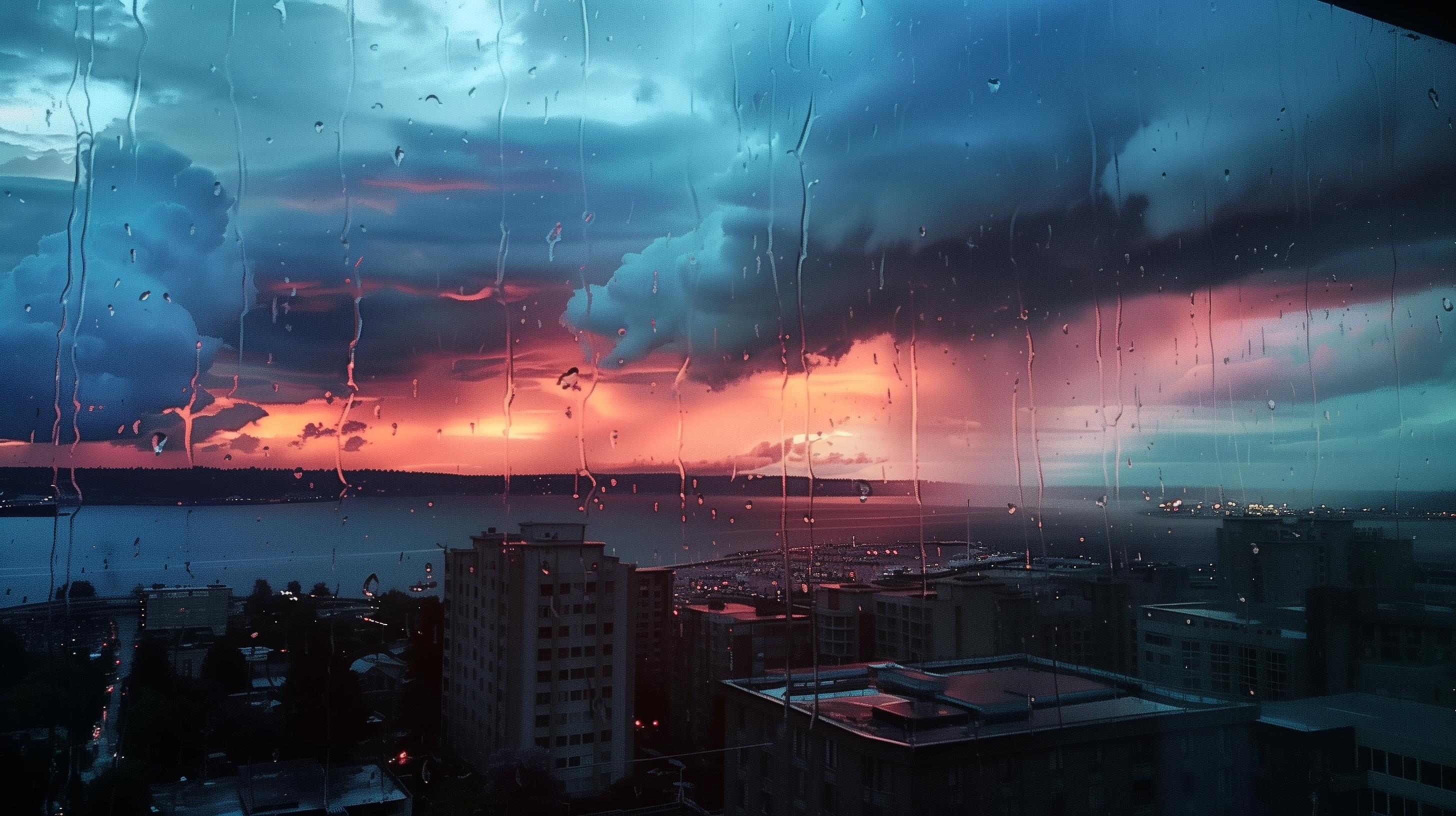A photo realistic view of Seattle, Washington from an apartment window overlooking the bay with thunderclouds in the distance. The image captures a mysterious, tentacled foggy formation sitting behind the clouds as the city skyline is visible through the raindrops on the window.
