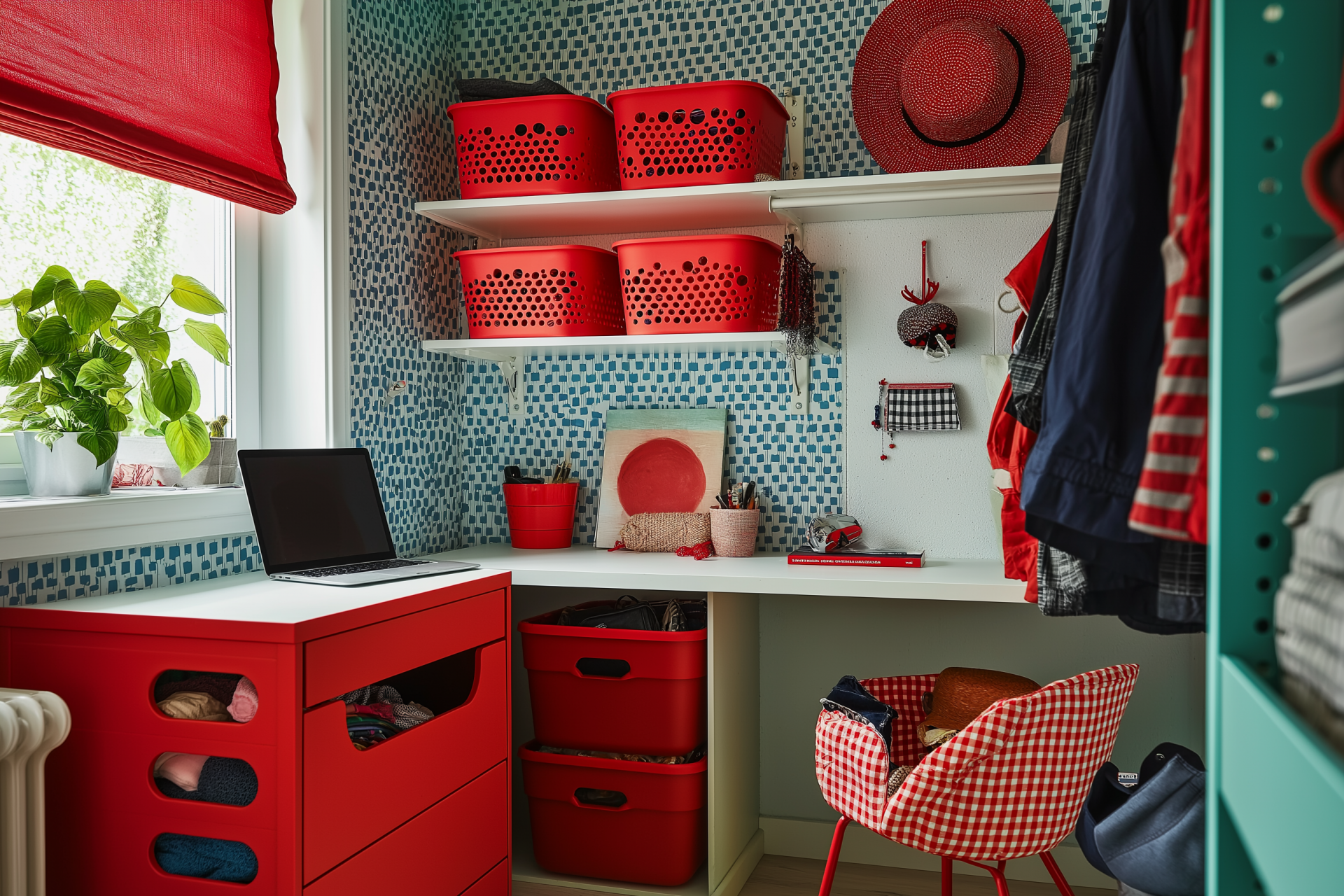 The image captures a lively and well-organized bedroom with a vibrant red, white, and blue color scheme. Bright red storage containers and a geometric patterned wallpaper create a playful and energetic atmosphere.