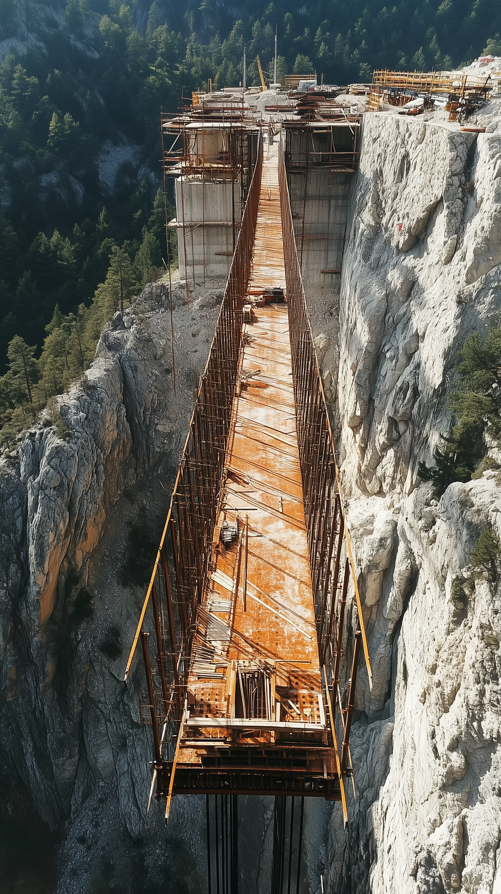 The image showcases the dynamic scene of a bridge being constructed over a river. Workers and heavy machinery are actively engaged in building, conveying a sense of progress and industry.