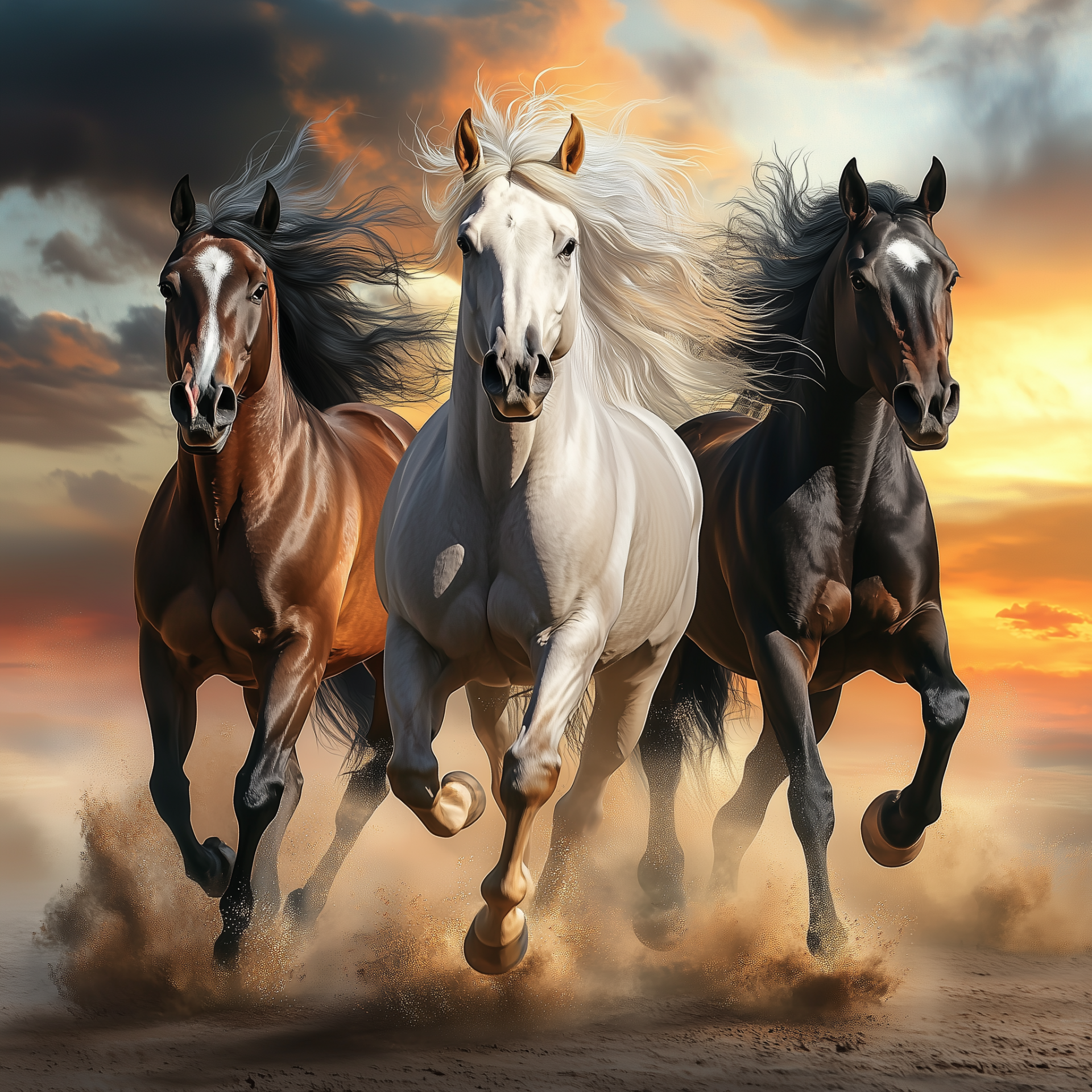 The image depicts three horses galloping towards the viewer, showcasing their powerful forms and energy. The background is stunning and hyperrealistic, providing a dramatic contrast that enhances the majestic presence of the horses.