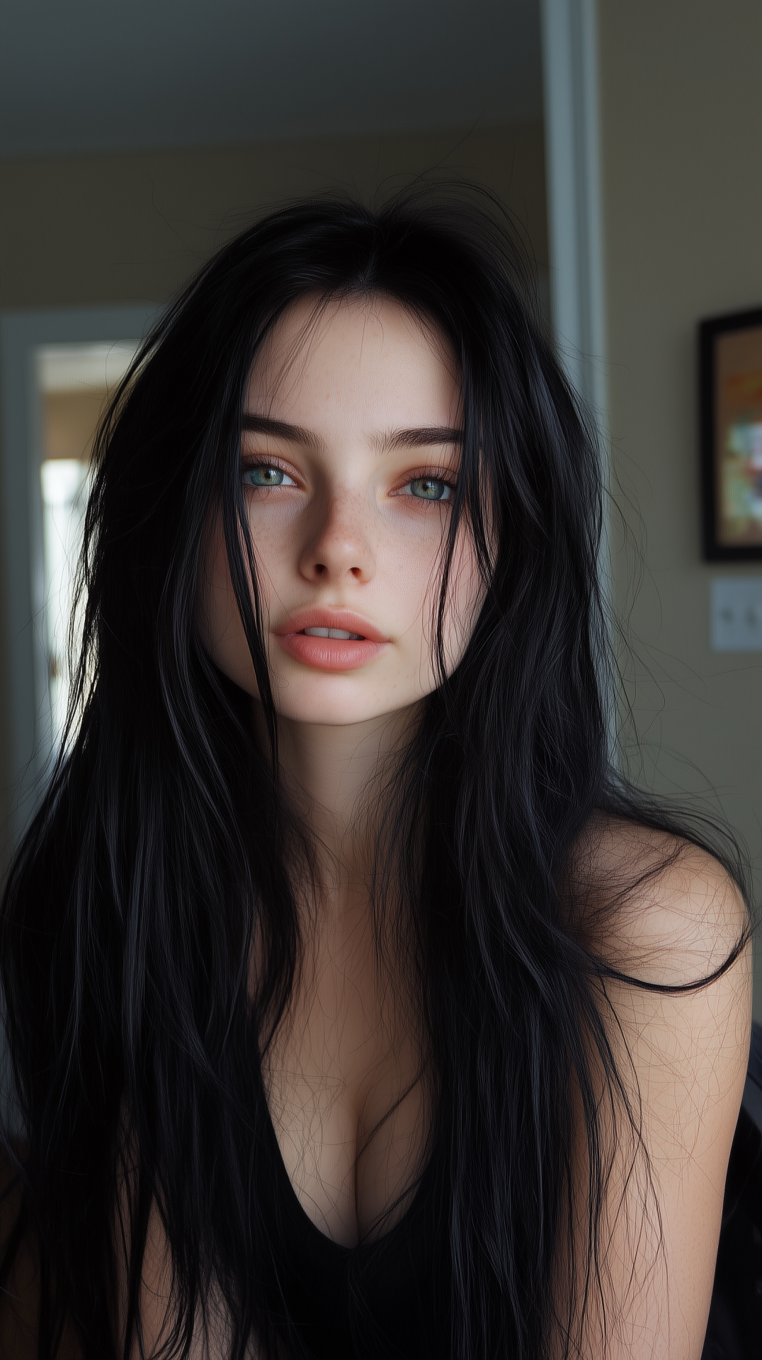 A young woman with long black hair sits with a melancholic expression, evoking a sense of sorrow. The soft lighting highlights her features, creating an intimate and emotional atmosphere.