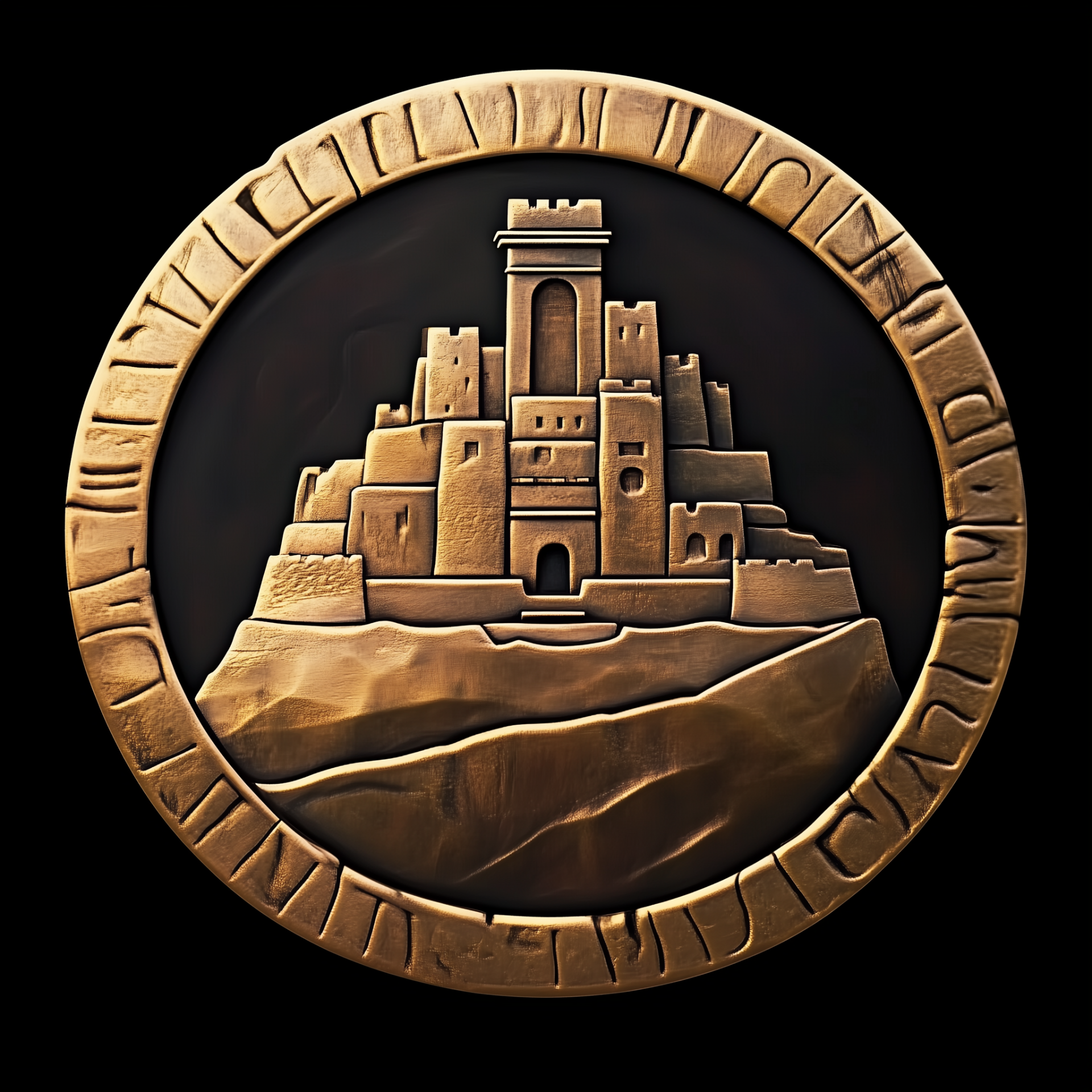 This illustration features a beautifully designed ancient bronze coin showcasing an embossed ancient city. The graphic and painterly style, combined with realistic surfacing and shading, creates a striking visual against a black background.