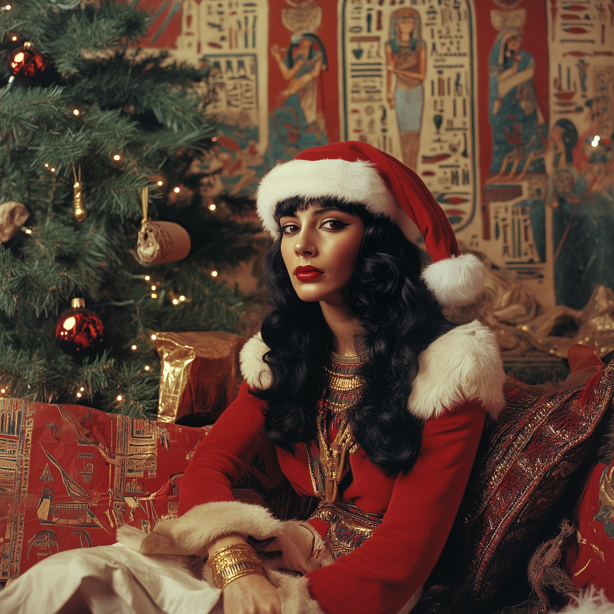 This photograph depicts a stunning portrayal of Cleopatra dressed in festive Christmas clothing, blending traditional elements with historical flair. The background features an ancient Egyptian scene, enriched with festive decorations that evoke a warm, holiday atmosphere.