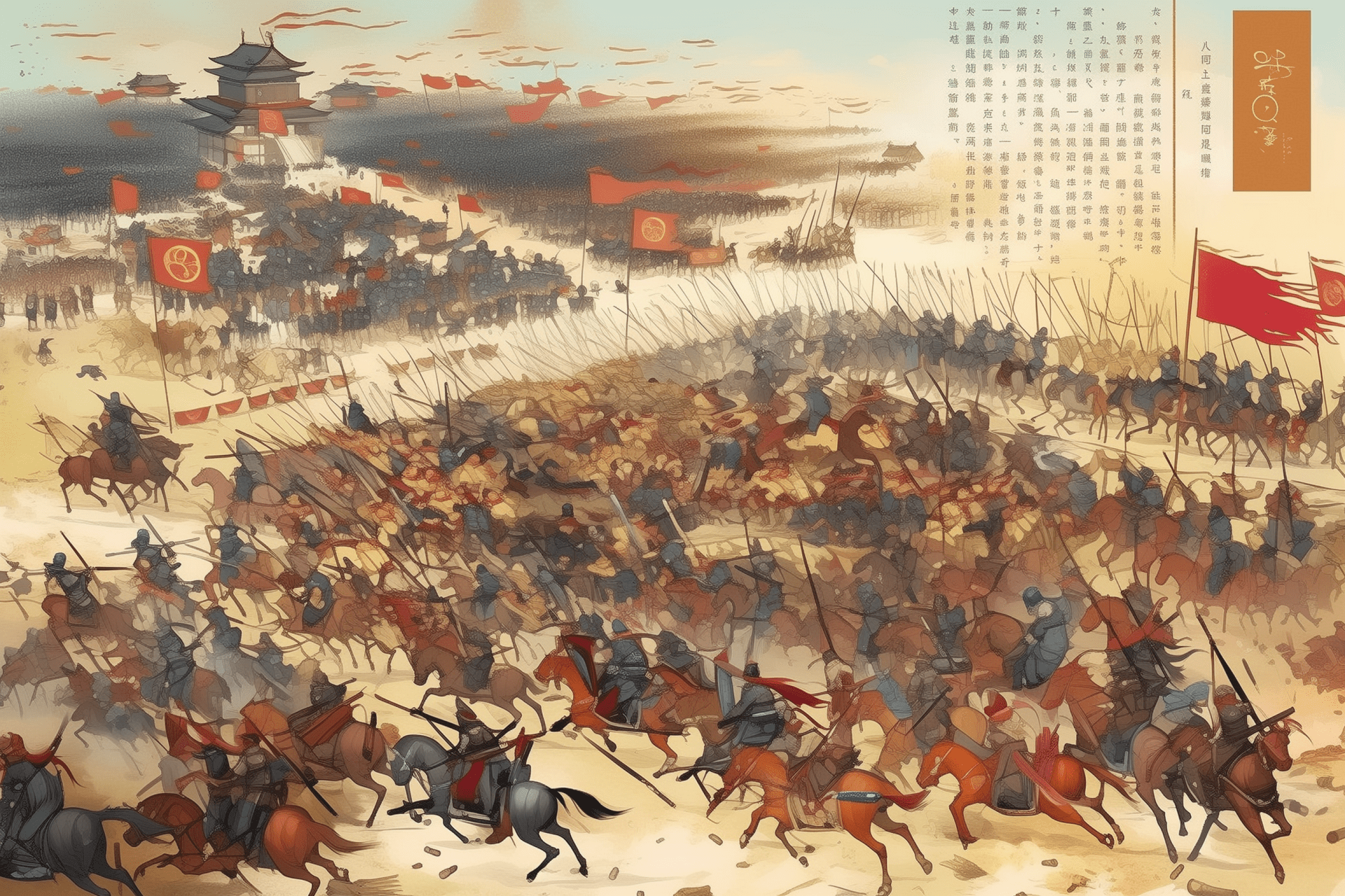 The image depicts a strategic formation of ancient Chinese armies, showcasing the intricate details of their weapons and uniforms. The background features a battlefield near an ancient city, with small figures representing enemy forces in the distance.