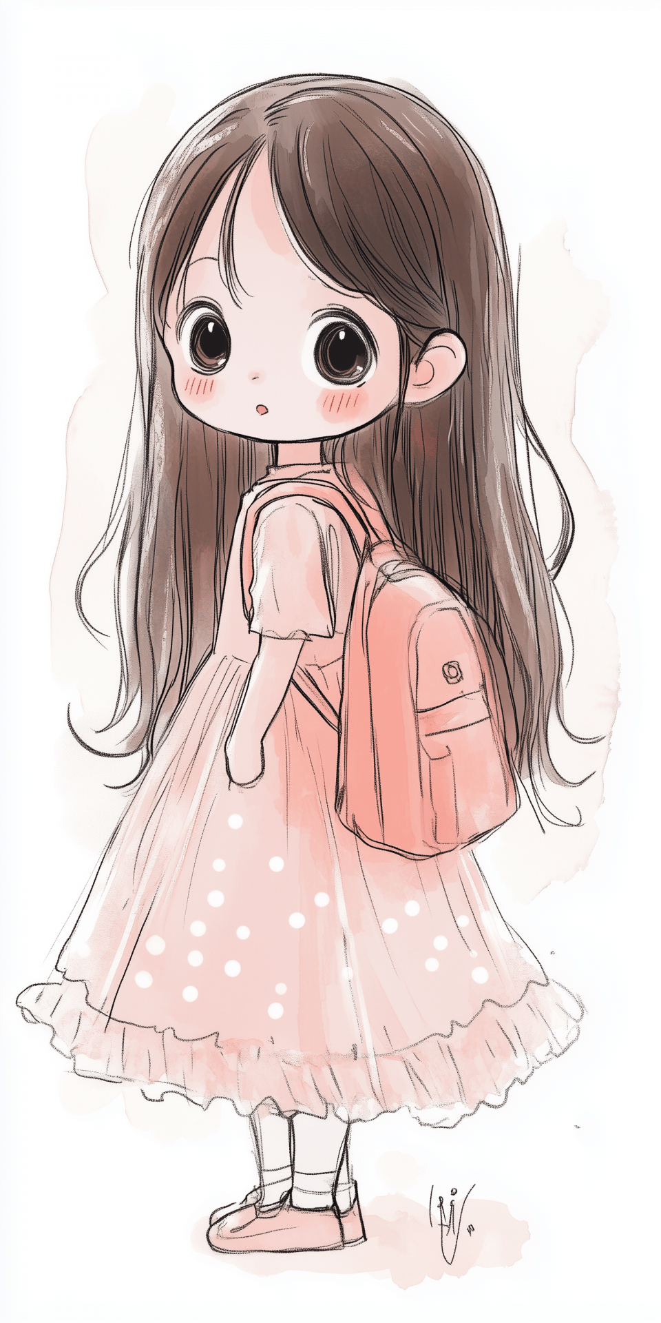 This illustration features a cute little girl with long hair and big eyes. She is wearing a pink polka dot dress and an orange backpack, drawn in a delicate style reminiscent of Japanese anime and Ghibli animation.