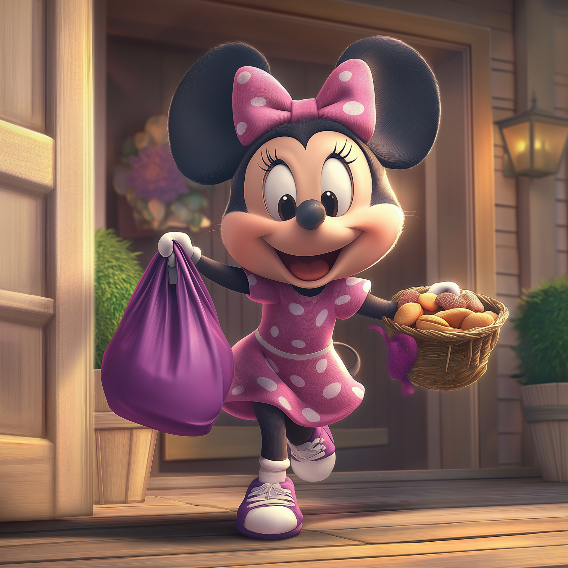 The image showcases a cheerful animated scene where a character enters a vibrant clubhouse. The character is adorned in a playful outfit, complete with a headband and colorful shoes, carrying a bag of food that adds to the whimsical atmosphere.