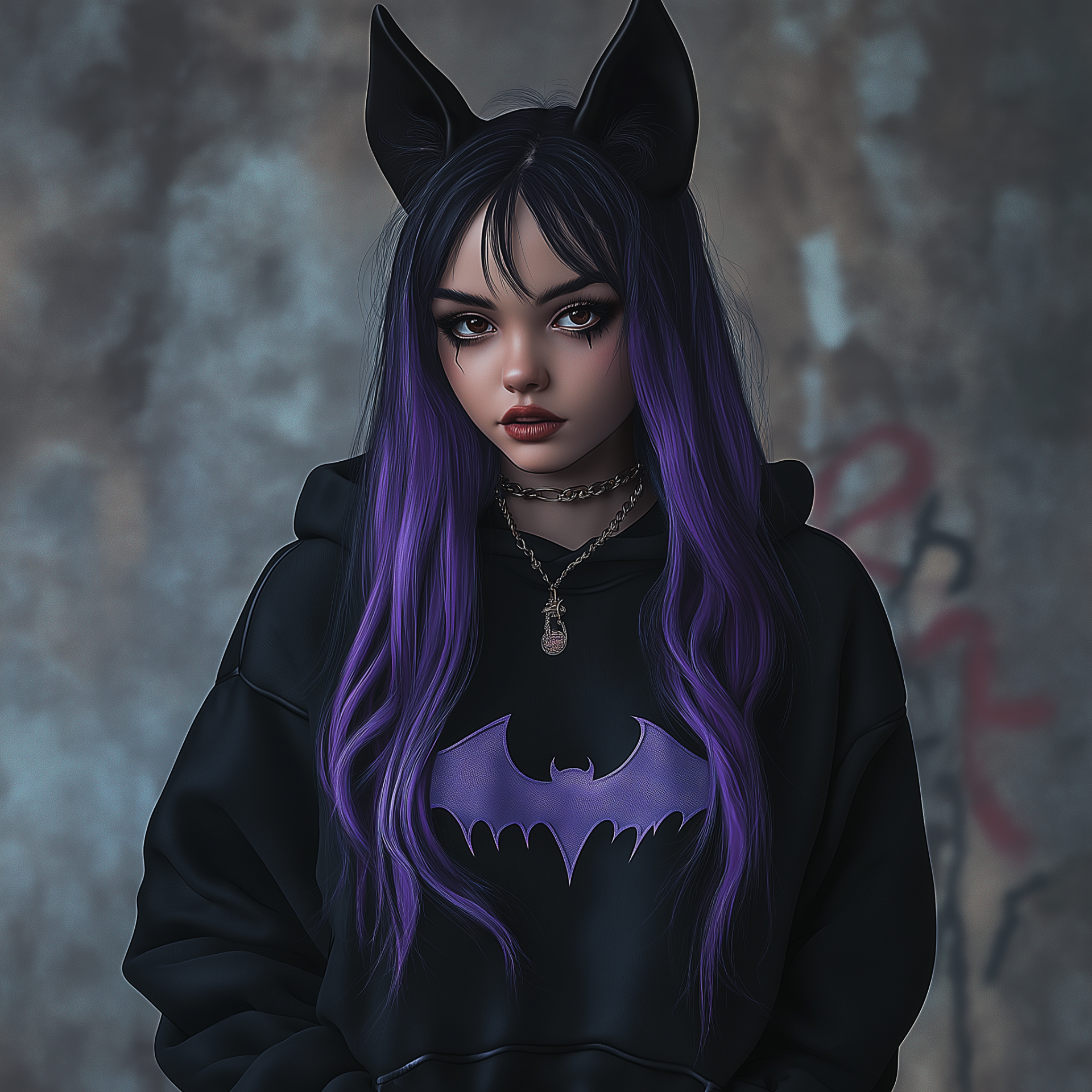 The image showcases a woman with bat ears, exuding an intriguing and mystical aura. She is depicted in a full black sweatshirt, with striking purple and black hair, capturing the essence of anime art with vibrant colors and high detail.