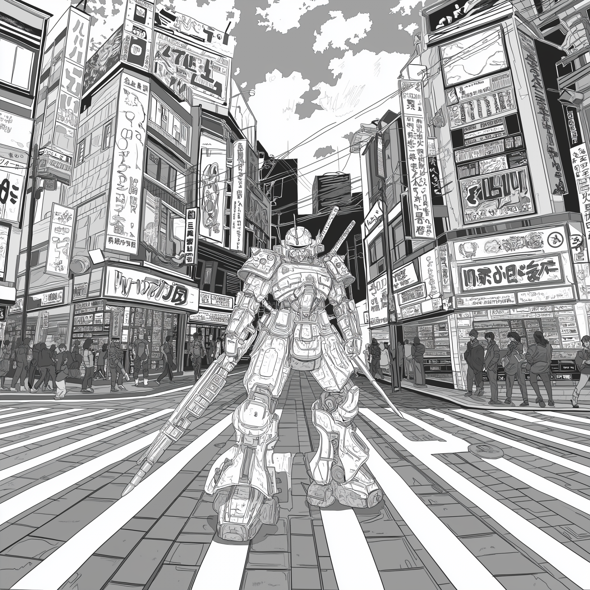 The image features a samurai robot designed in a detailed black and white style, suitable for coloring. It embodies elements of Japanese anime, with intricate lines and a dynamic pose that evokes a sense of adventure.
