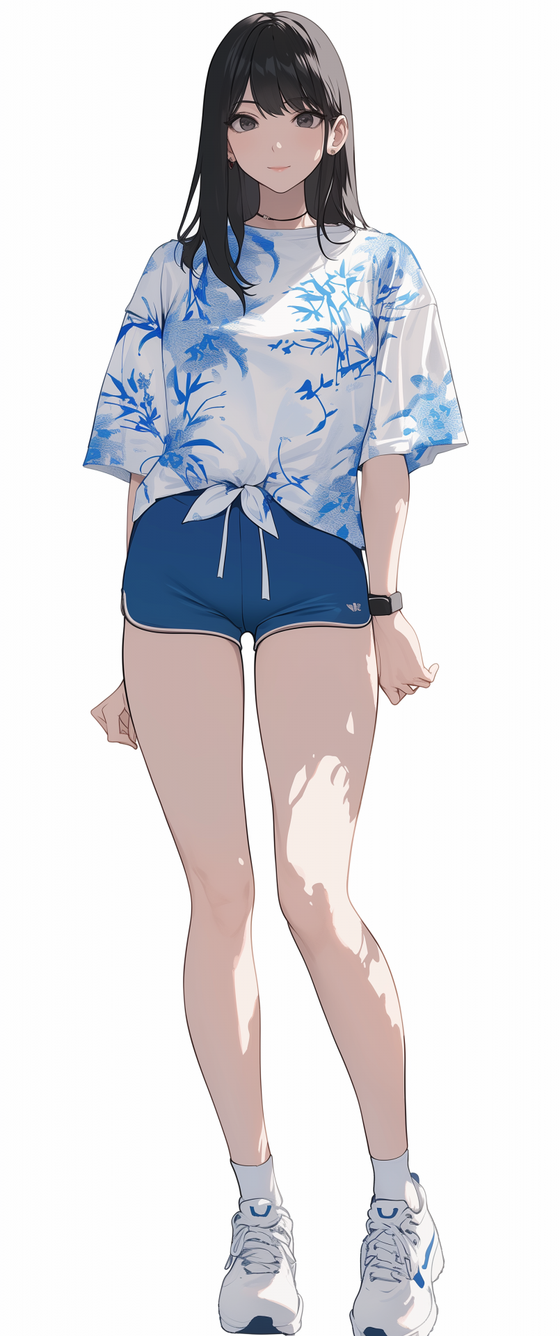 This image features a beautiful anime woman with striking black straight hair, confidently facing the camera. She stands still in a full body shot, exuding a sporty and dynamic energy.