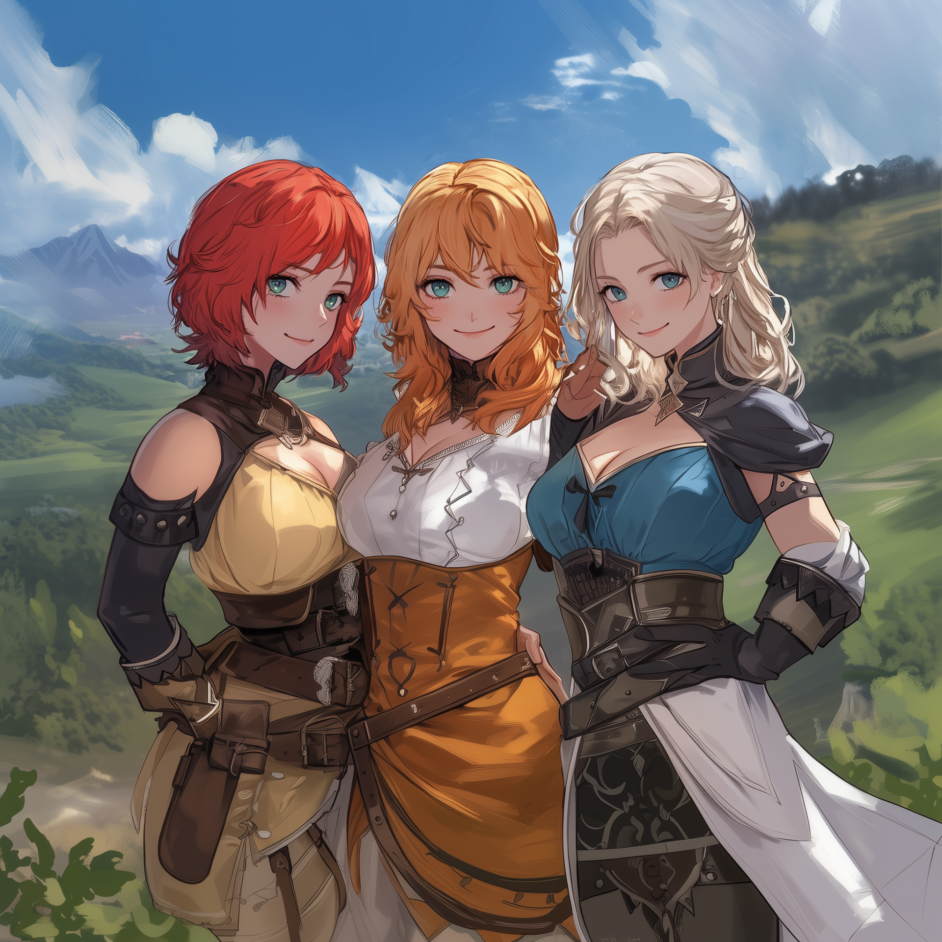 The image features three vibrant anime women with distinct hairstyles and captivating eye colors. Each character exudes a joyful and magical aura, cleverly illustrated in a dynamic and colorful art style.