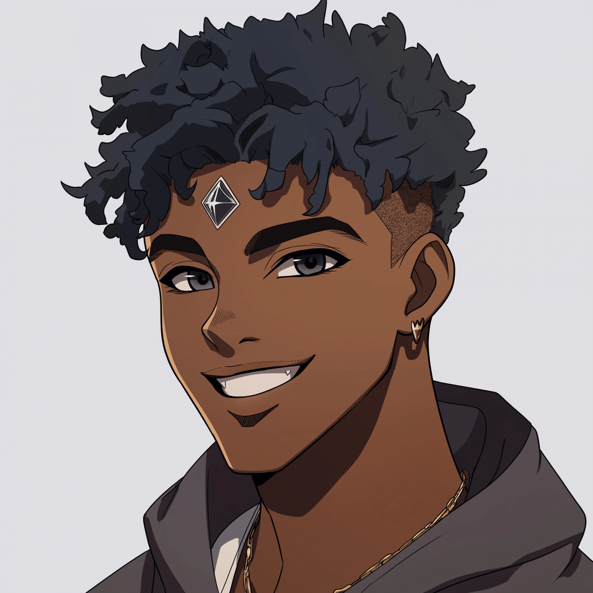 The image showcases a cheerful black male teenager in an anime art style. He has a small grey diamond-shaped tattoo on his forehead, enhancing his expression of joy.