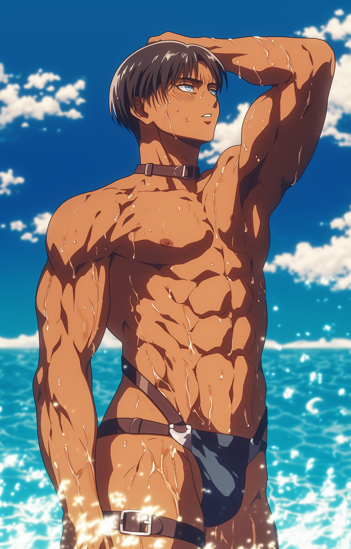 The image portrays a stylized anime character with a muscular build and a tanned complexion. Emphasizing a bold aesthetic, the character is depicted with a dog collar, exuding a confident and captivating presence.