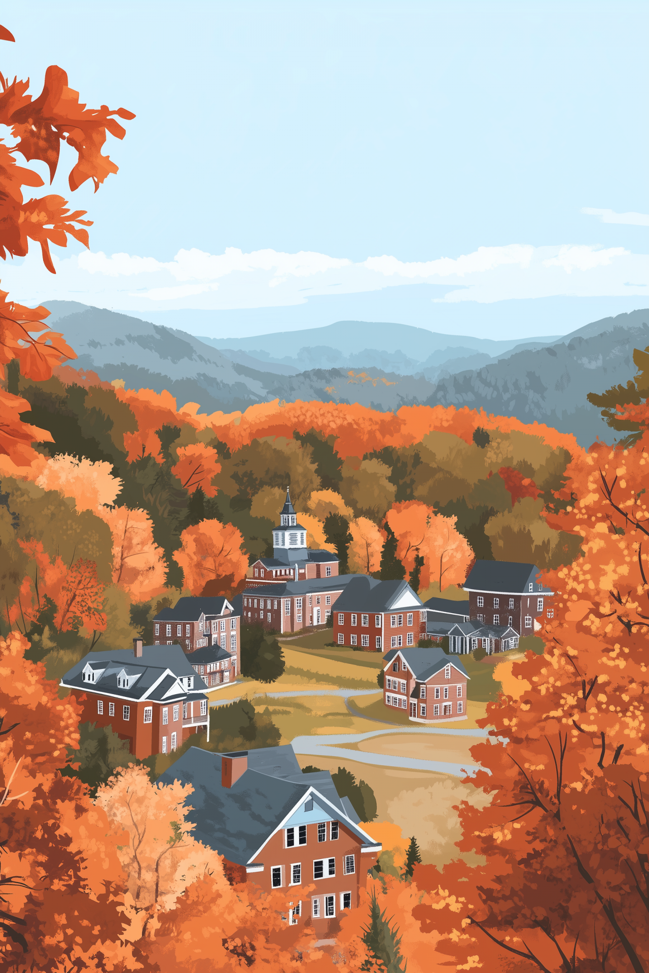 This illustration depicts a quaint small college nestled in the serene Appalachian mountains. The view from a ridge provides a sense of tranquility and mystery, perfect for a cozy book cover.