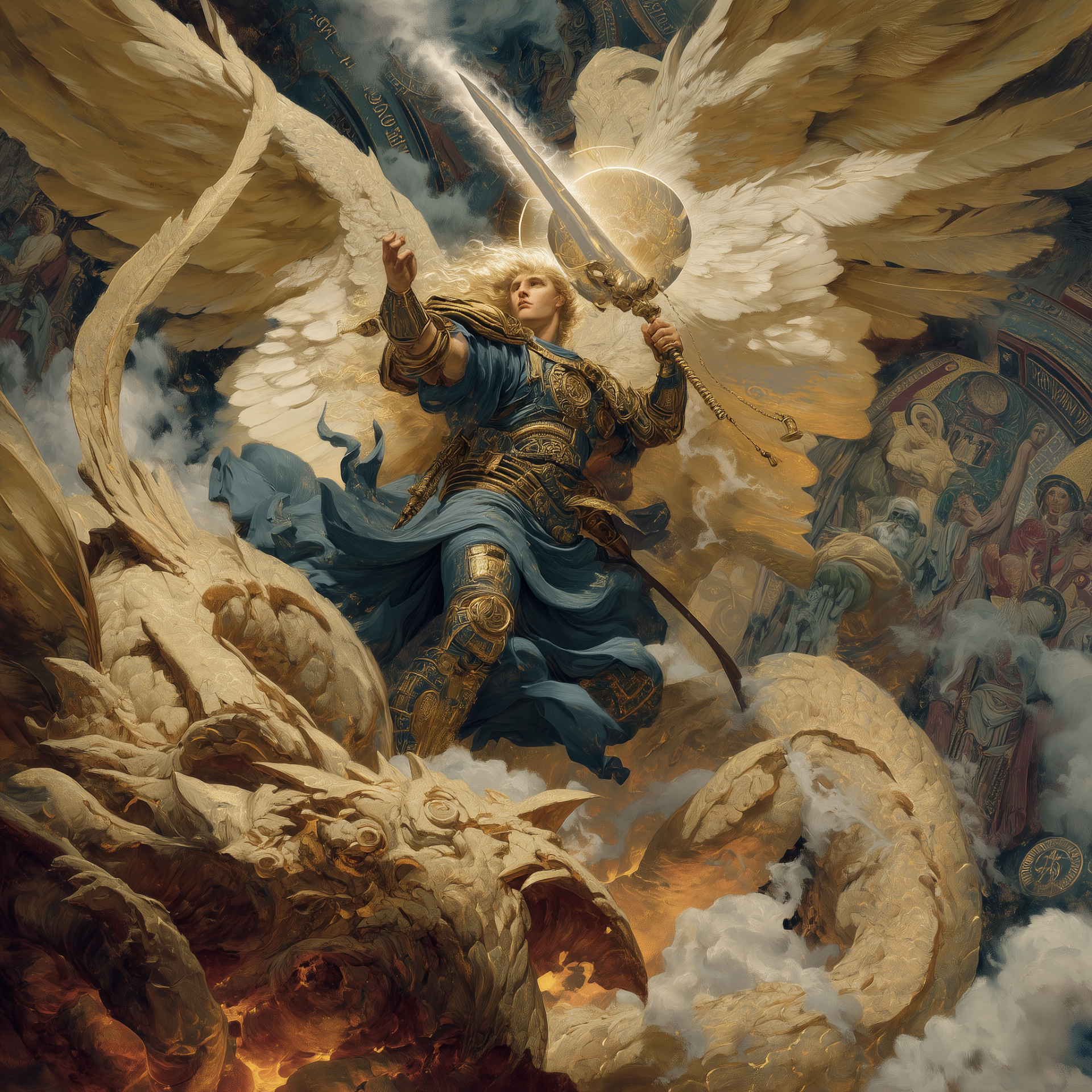 The image features a striking male archangel with large, shimmering golden wings. He is adorned in an intricate steampunk outfit that adds a unique and imaginative flair to the celestial presence.