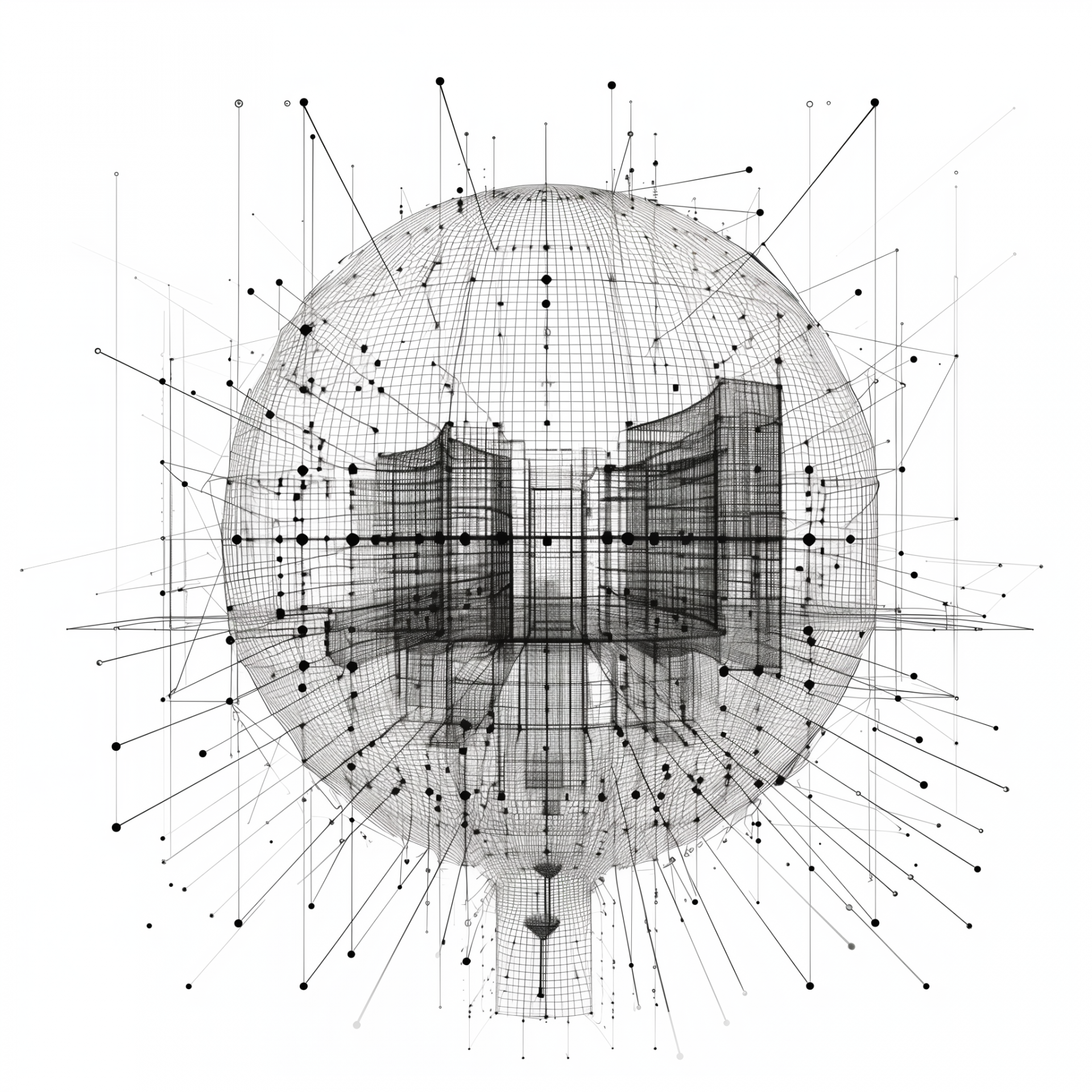 This image depicts a detailed blueprint of a round building, presented in a monochrome style. The intricate grid lines and black outlines on a white background create a digital, high-quality appearance.