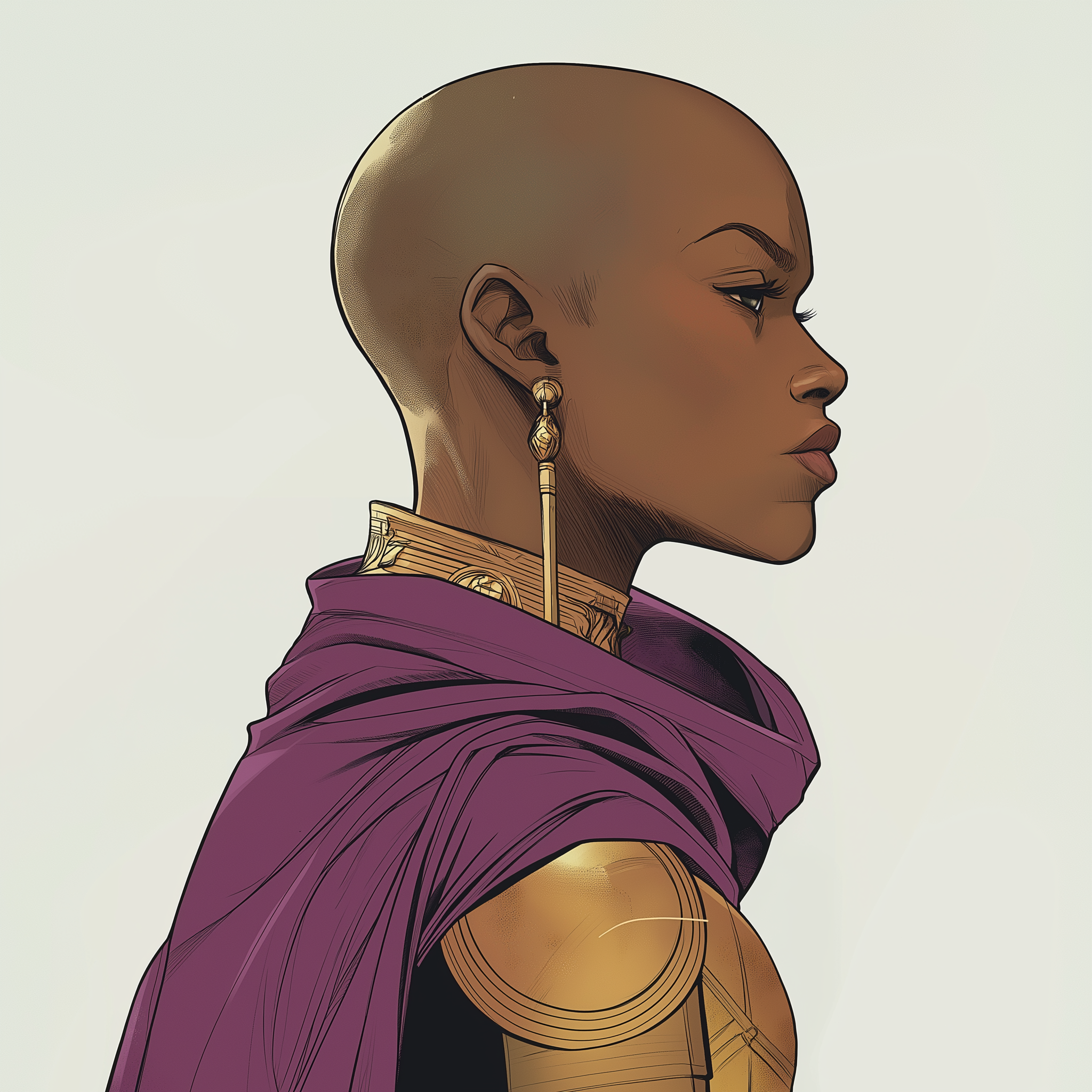 The illustration features a black bald woman with a proud and regal expression. She is adorned in a purple cloak and gold and maroon armor, holding a spear, exuding a strong and confident presence.
