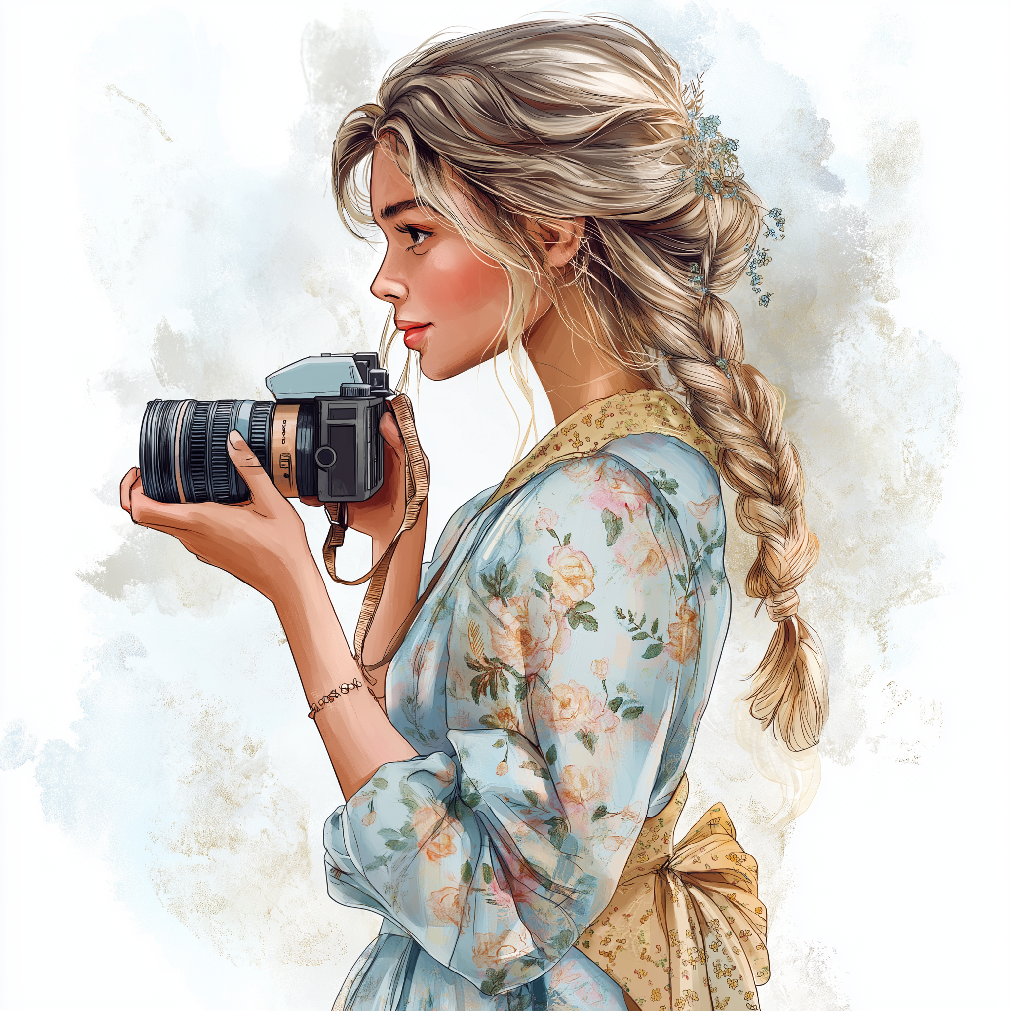 This illustration features a girl with dark blonde hair styled in a loose braid, holding a camera while wearing a floral pattern dress. The colors are soft and warm, incorporating beige, blue, green, and white with golden accents, creating a peaceful and artistic atmosphere.