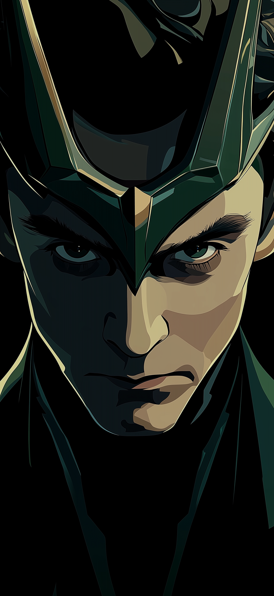 This image presents a minimalistic design featuring a portrait of a character with clean lines and flat vector graphics. The solid dark background enhances the simplicity and cinematic quality of the composition.