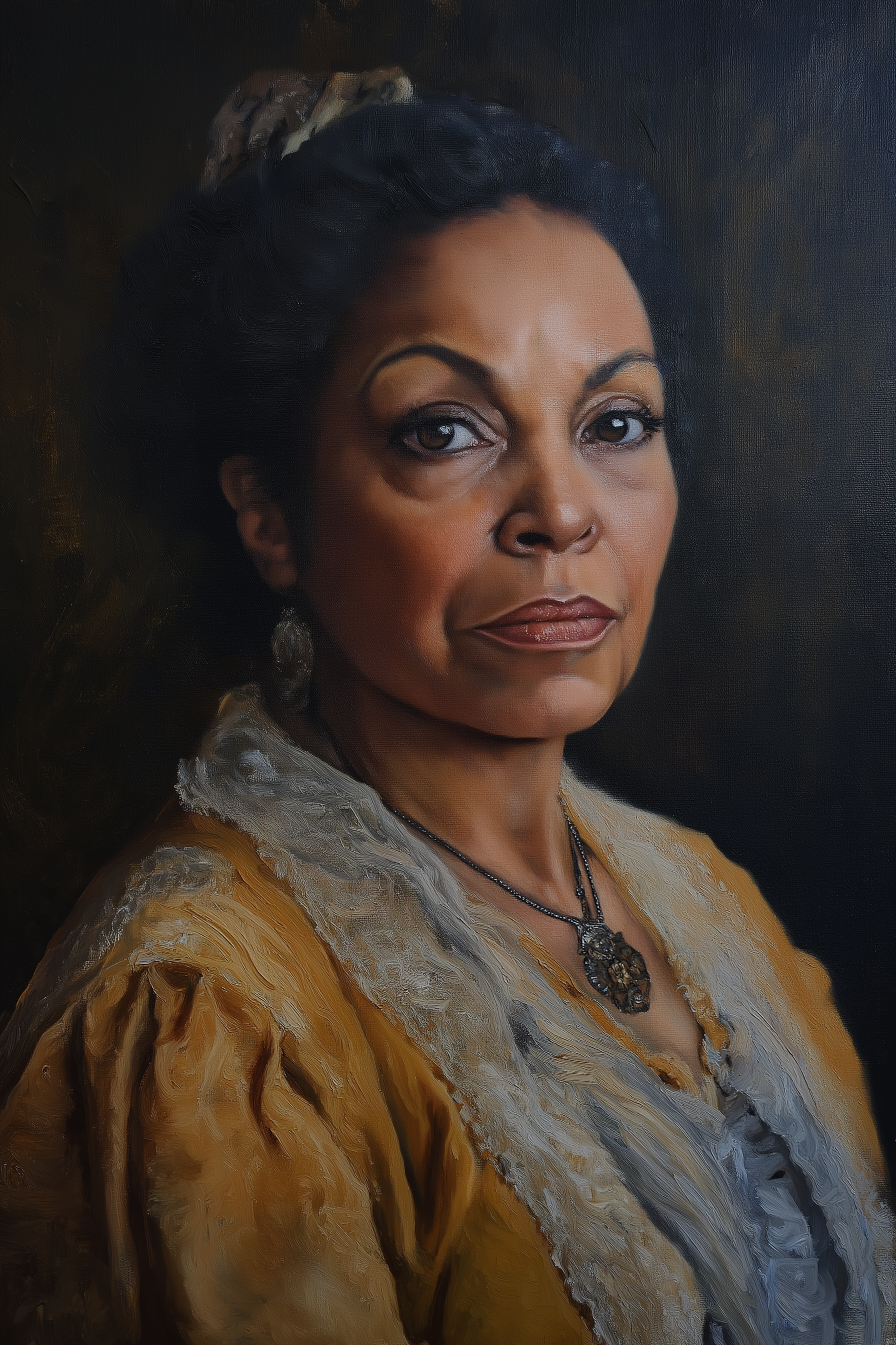 This illustration showcases a stunning portrait of a beautiful middle-aged woman. The painting captures her grace and serenity, with soft brushstrokes that convey a warm and inviting atmosphere.