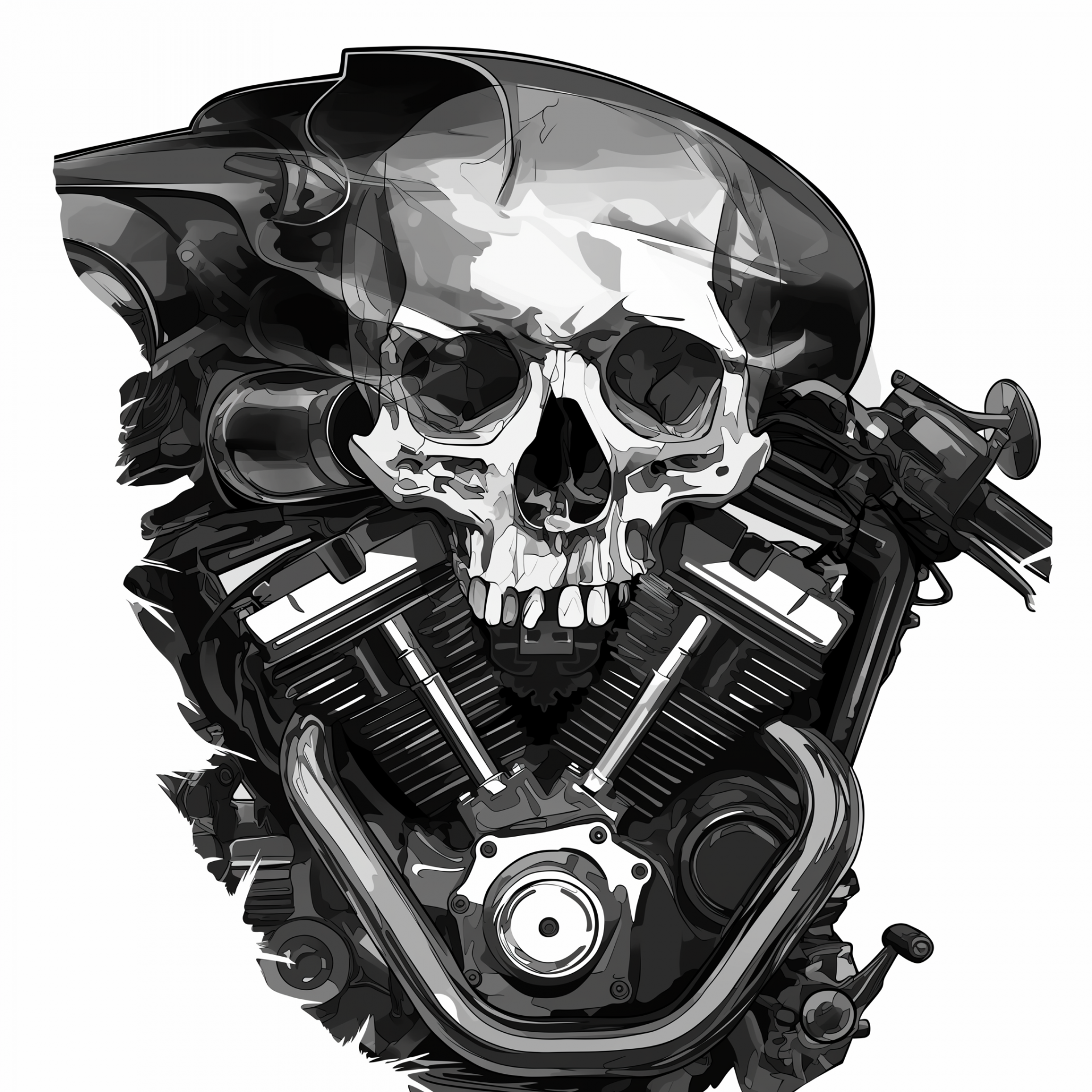 This illustration features a highly detailed skull intertwined with mechanical elements, creating a striking contrast between organic and industrial. The black and white palette enhances the dramatic effect, adding depth and intensity to the design.