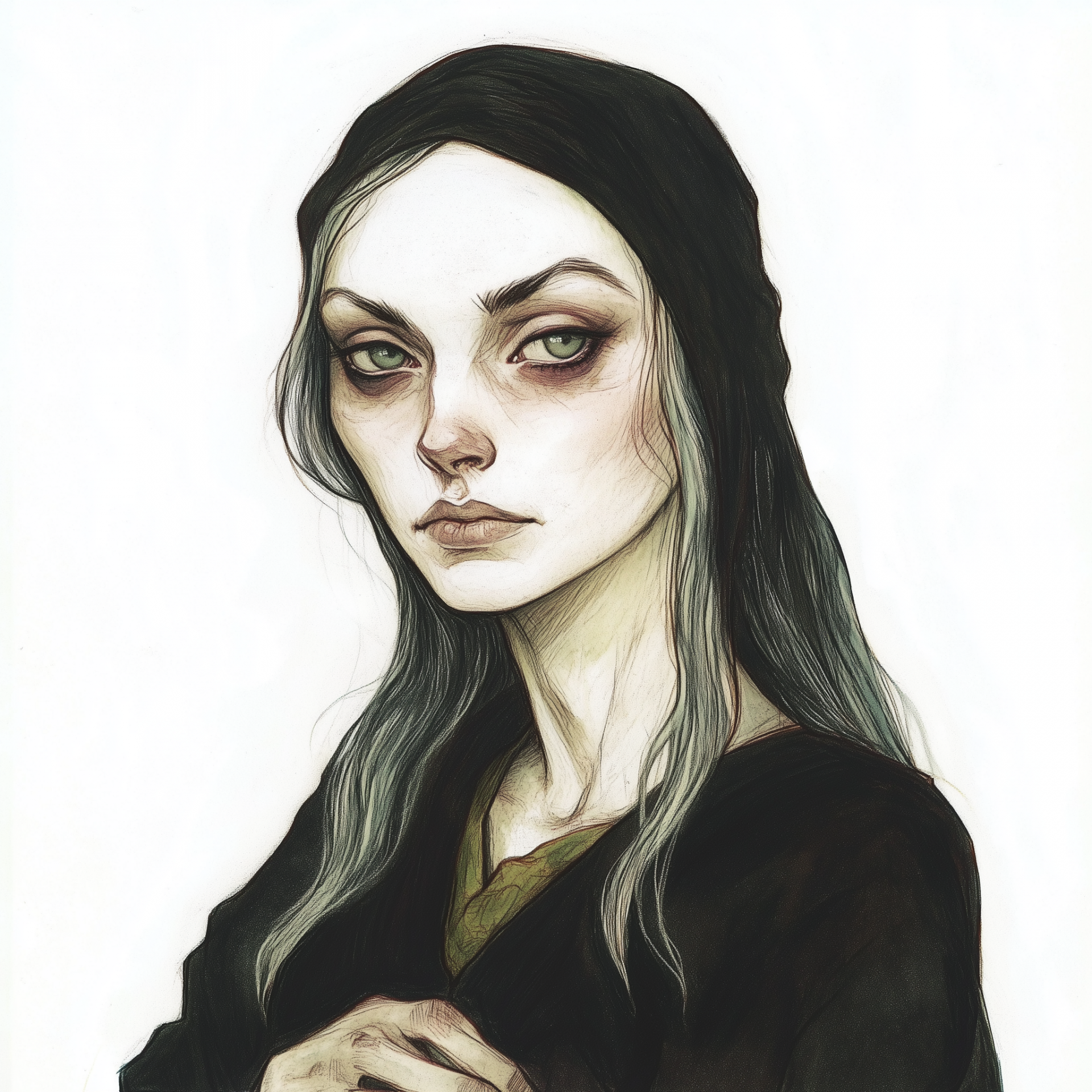 This illustration features a striking woman with ghostly pale skin and long black hair, exuding an air of mystery. She is dressed in black attire, set against a plain white background that enhances her captivating presence.