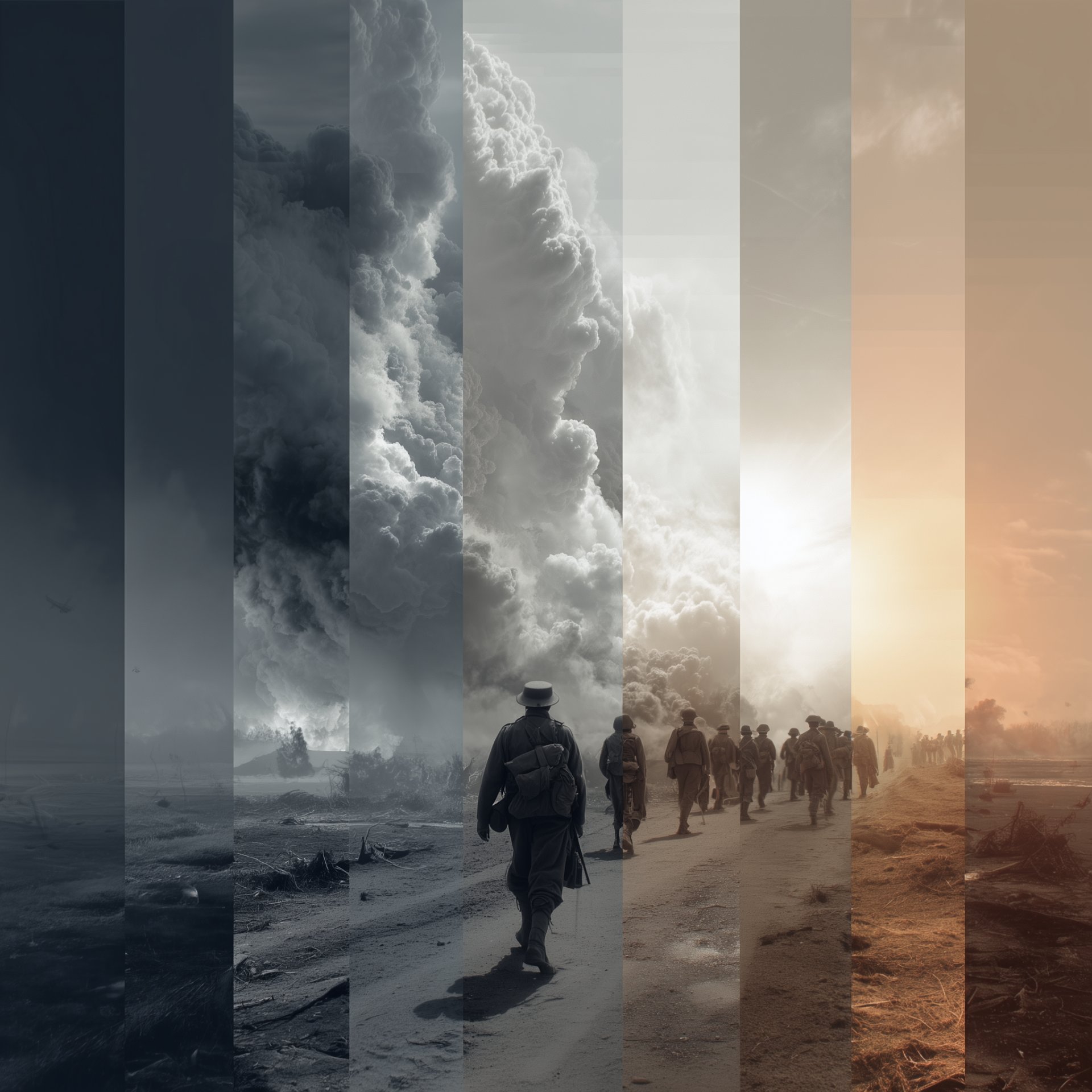 This illustration presents a military war scene featuring a distant fighter jet soaring above ruined European buildings. The wireframe art style uses light green outlines against a solid black background, creating a smoky and hazy atmosphere that enhances the somber mood of the scene.